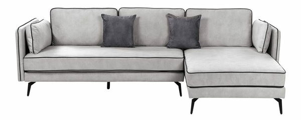 Pohodlie a dokonalý vzhľad – to je niečo, čím táto rohová pohovka vyniká. Je čalúnená kvalitným a odolným zamatovým polyesterom v klasickej svetlosivej farbe, s ktorým krásne kontrastuje čierne lemovanie na sedacej časti, opierkach rúk a operadle. Hrubý sedací vankúš robí z tohto modelu skvelé miesto na odpočinok, zatiaľ čo kovové nohy zabezpečujú stabilitu celej konštrukcie. Vďaka svojmu dizajnu sa pohovka hodí do interiérov v rôznych štýloch, ale najlepšie vynikne v tých moderných.