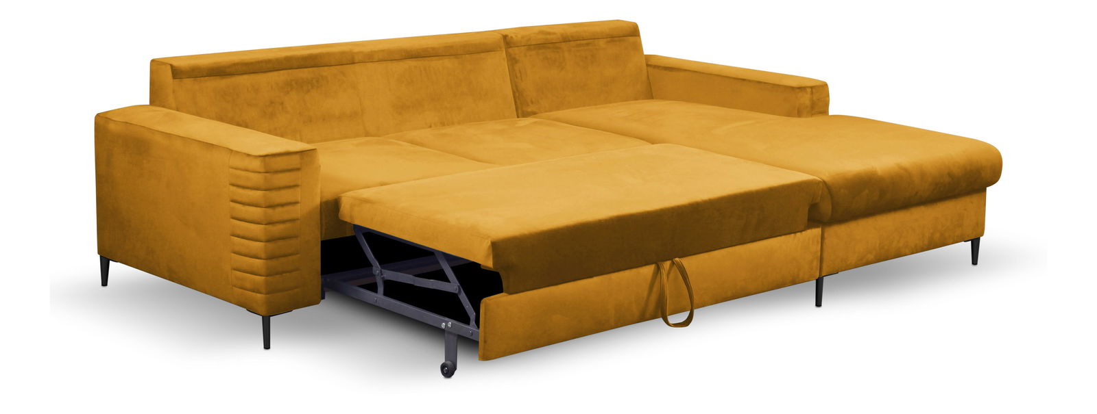 - Rozkladacia funkcia pomocou vozíka poskytuje spaciu plochu s rozmermi 140 x 212 cm, vhodnú pre návštevy alebo príležitostné prespanie, ideálnu aj do dvojizbových bytov s obmedzeným priestorom.