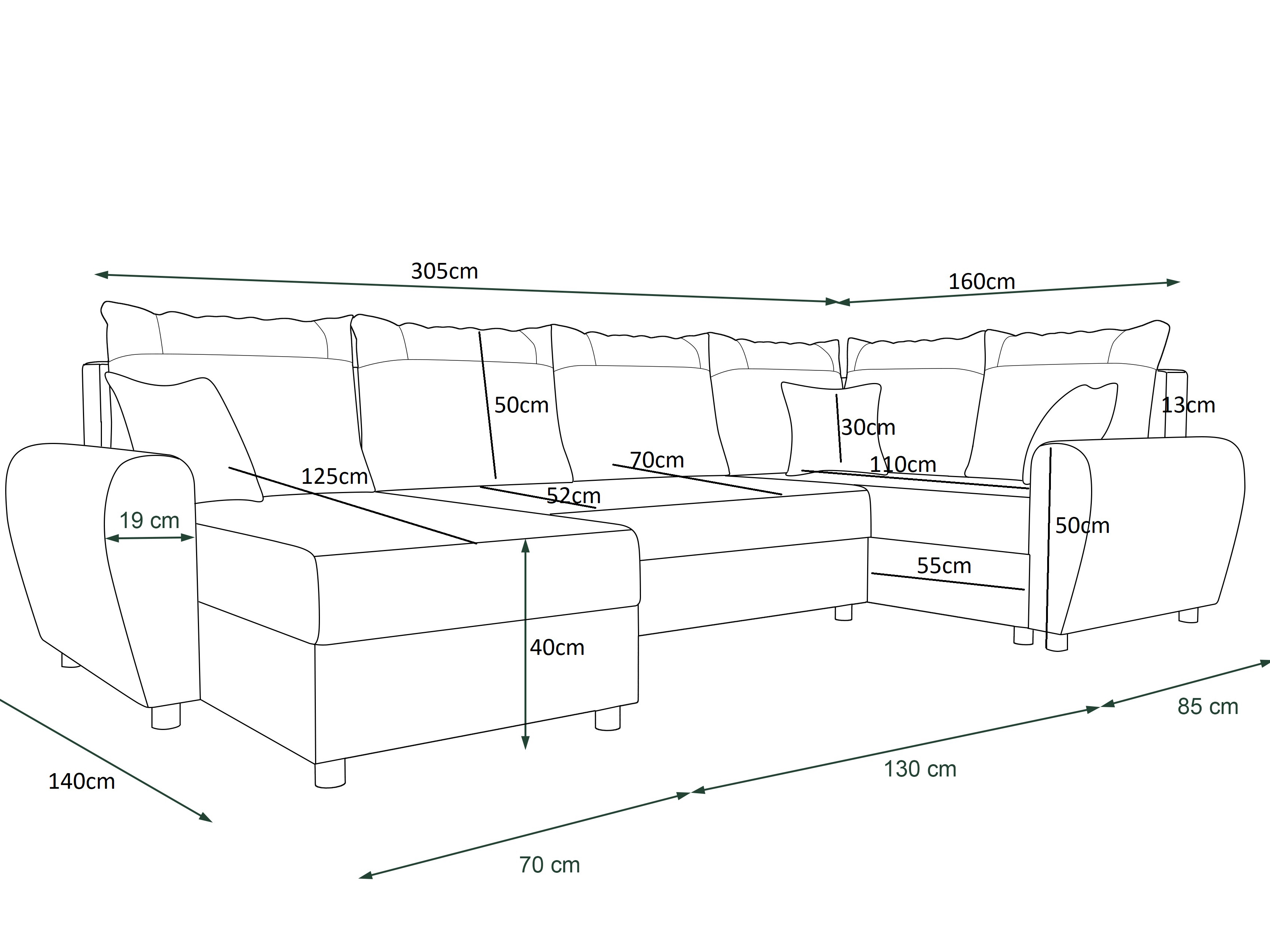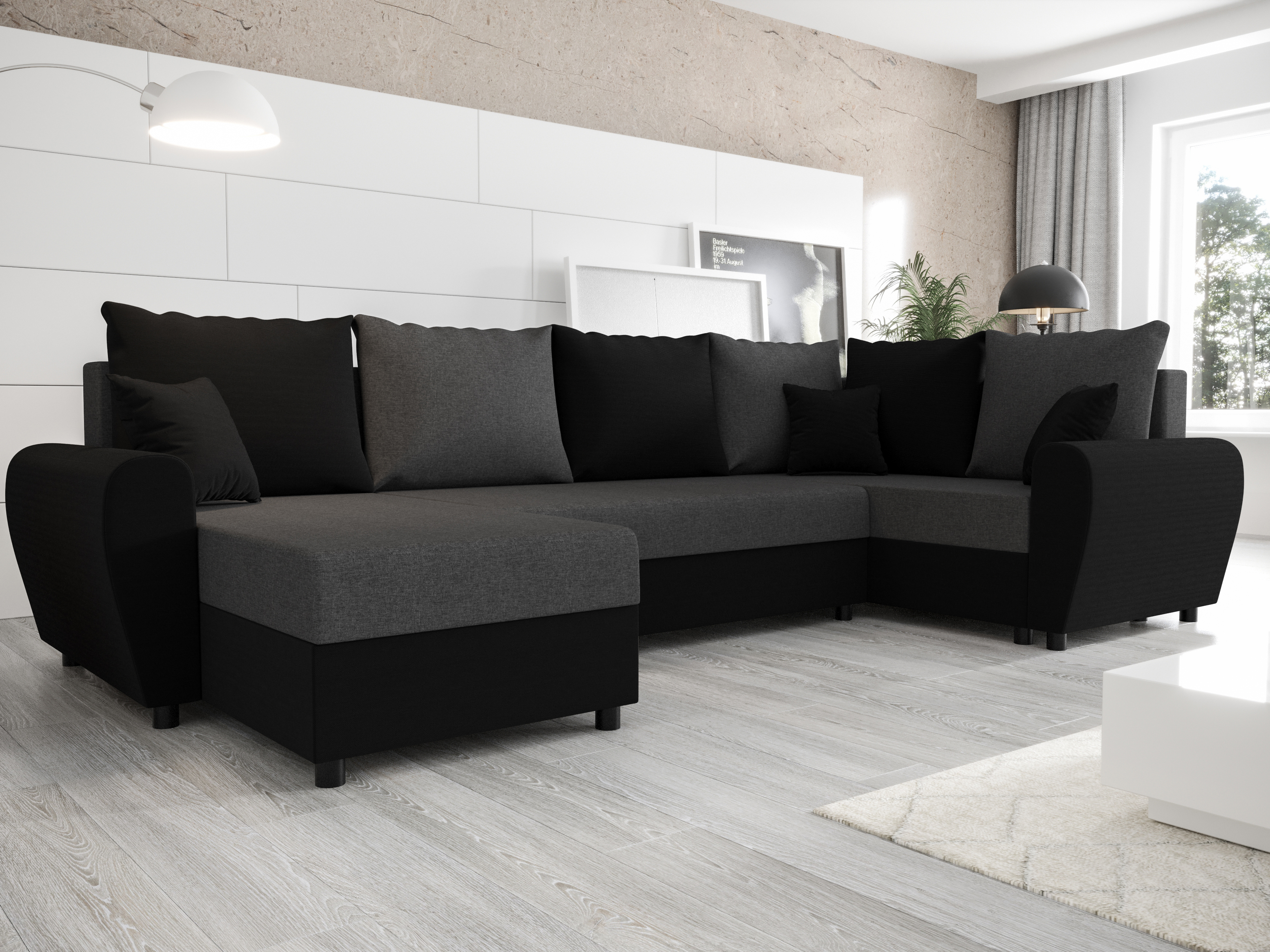 Rohová sedačka v tvare U Fleur Long v kombinácii čiernej a sivej farby je ideálnym riešením pre moderné obývacie izby, ktoré vyžadujú štýlový a zároveň praktický nábytok. Vďaka svojim rozmerom 305 x 140 cm poskytuje dostatok priestoru pre celú rodinu či priateľov, čím sa stáva centrom spoločenských chvíľ aj relaxu. Jej pevná konštrukcia z dreveného rámu a drevotriesky zaručuje dlhodobú odolnosť, zatiaľ čo polyuretánová pena T30 spolu s falistými pružinami zabezpečujú pohodlné sedenie a kvalitný odpočinok.