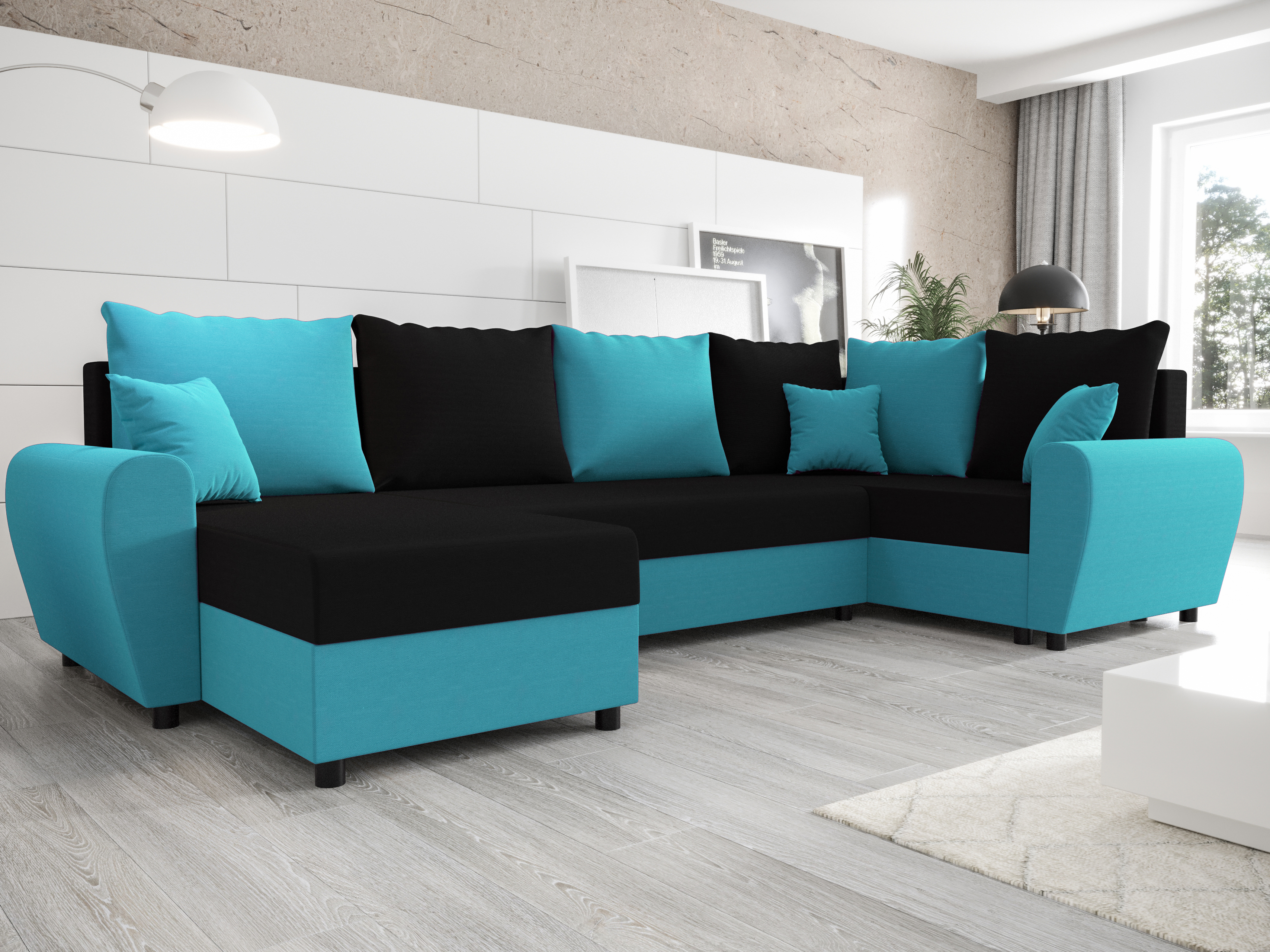Rohová sedačka v tvare U Fleur Long v kombinácii tyrkysovej a čiernej farby prináša do vášho obývacieho priestoru svieži a moderný dizajn, ktorý zaujme na prvý pohľad. Tento veľkorysý sedací nábytok je ideálny pre rodinné posedenia, spoločenské stretnutia alebo relax po náročnom dni. Vďaka pevnej konštrukcii z dreveného rámu a drevotriesky je sedačka stabilná a odolná, pričom polyuretánová pena T30 spolu s falistou pružinou zabezpečujú maximálny komfort pri sedení.