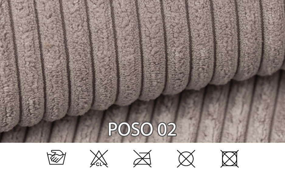 Látku Poso radíme medzi velúrovú tkaninu. Jedná sa o tkaninu podobnú plyšu s krátkym vlasom, ktorá sa vyznačuje zamatovo jemným povrchom. Svojim typickým vzhľadom pripomína menčester. Vyznačuje sa dostatočnou pevnosťou a odolnosťou. Využíva sa v nábytkárstve ako poťahová látka na čalúnený nábytok. Na údržbu a čistenie používajte navlhčenú handričku a špeciálne prostriedky pre čalúnený nábytok či mydlovú vodu. Gramáž: 380 g/m². Zloženie: 100% polyester.