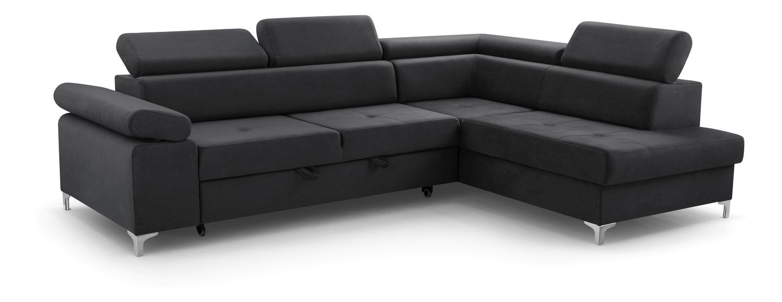 Rohová sedacia súprava - Madeira (grafit) (P) je moderného štýlu sedacia súprava s masívnym dreveným rámom a drevotrieskovou konštrukciou. Ponúka pohodlné sedenie vďaka bonellovej pružine a pene T 30. Opierky sú vyrobené z kombinácie peny, silikónu a sú doplnené poťahovými lištami pre maximálny komfort. Táto multifunkčná sedačka má rozkladací mechanizmus typu "delfín" a je vybavená úložným priestorom. Plocha na spanie má rozmery 127x203 cm, poskytujúc dostatočný priestor pre pohodlný odpočinok. Zadná strana sedačky je potiahnutá rovnakou látkou ako predná, čo umožňuje jej umiestnenie do stredu miestnosti. Sedacia súprava je dostupná v tvare "L" a má regulovateľné opierky vrátane opierok hlavy a lakťov, čo zvyšuje komfort pri sedení. Výška sedačky s zdvihnutou lakťovou opierkou je 76 cm a s opierkou hlavy 95 cm.