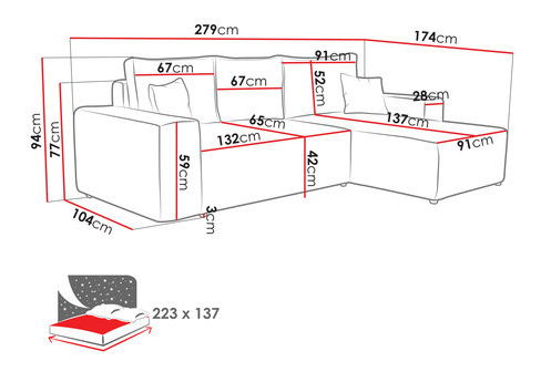 ZobraziťSedacia súprava je ideálnou voľbou pre tých, ktorí hľadajú pohodlie a štýl. Izbová rohová pohovka s funkciou spania je kombináciou dizajnu, funkčnosti a pohodlia. Pozýva vás k odpočinku a ponúka praktické riešenia pre vašu domácnosť. Či už máte chuť relaxovať, alebo potrebujete priestor pre svojich hostí, tento elegantný model je pripravený splniť vaše najtajnejšie sny o krásnom interiéri. Rozmery: Dĺžka: 279 cm, šírka: 181 cm, výška: 94 cm, plocha na spanie: 223 x 137 cm, rozmery kontajnera: dĺžka: 128 cm, šírka: 68 cm, výška: 24 cm Rohová strana: ľavá alebo pravá Prevedenie: Rám: borovicové drevo + 16 mm hrubá drevotrieska, sedadlo a operadlo: pena T25 + vlnitá pružina typu A, rohová pohovka je rozkladacia, automatické uľahčenie rozkladania, typ DL, funkcia spania, nádoba na lôžkoviny, čierne plastové nohy, operadlo vo forme pohyblivých vankúšov, vankúše plnené granulátom, zapínanie na zips, Rohová pohovka je voľne stojaca (zadná časť je čalúnená látkou). Záruka: 24 mesiacov