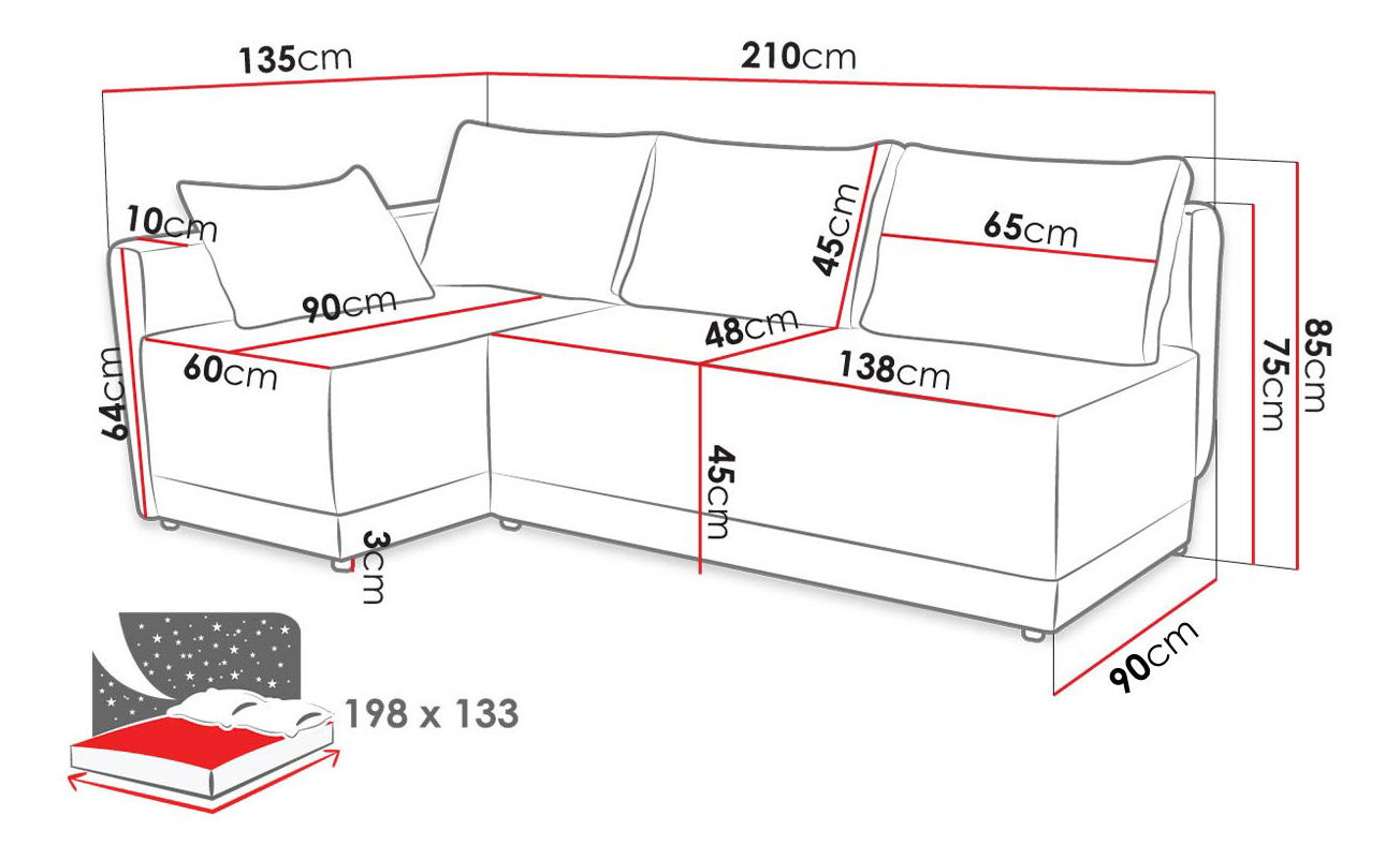 ZobraziťRohová sedačka je ideálnou voľbou pre tých, ktorí hľadajú pohodlie a štýl. Hľadáte sedačku, ktorá nahradí posteľ pre vás alebo vašich hostí? Ak áno, potom pre vás máme veľmi výhodnú ponuku - Piniata rohová sedačka ! Model je vybavený pružinami, ktoré sa považujú za odolné, a penou T25 / 42 pre pohodlie počas používania. Rohové podpery sú vyrobené z pohodlných vankúšov. Väčšie vankúše majú zips. Rohová sedačka má navyše funkciu na spanie 198 cm x 133 cm a úložný priestor na posteľnú bielizeň. Samotný proces rozkladania sedačky je veľmi jednoduchý a rýchly. Rohová sedačka nie je voľne stojaci model. Rozmery: dĺžka: 210 cm, šírka: 135 cm, výška: 85 cm, plocha na spanie: 198 x 133 cm Rohová strana: ľavá alebo pravá Prevedenie: rám: borovicové drevo + drevotrieska, operadlo: pena T25 / 42 + kostná pružina, sedadlo: T25 / 42 pena + kostná pružina, rozkladacia sedačka má funkciu spánku úložný priestor na posteľnú bielizeň, plastové nohy, operadlo vo forme pohyblivých vankúšov, vankúše v cene - veľké so zipsom - malé nie, sedačka nie je voľne stojací model (chrbát nie je pokrytý látkou) Rozmery úložného priestoru: - dĺžka: 120 cm, - šírka: 57 cm, - výška: 27 cm Záruka: 24 mesiacov