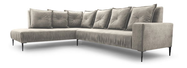 Rohová sedacia súprava Romain (svetlosivá) je luxusná a pohodlná sedacia súprava v štýle glamour. Je vyrobená z kombinácie masívneho dreva a drevotriesky, čo zaručuje stabilitu a odolnosť. Sedačka má bonellovú pružinu a 3 cm hrubú penovú výplň T 30, čo zabezpečuje komfortné sedenie. Opierky sú tvorené penou a silikónom, doplnené poťahovými lištami pre vyšší komfort. Táto sedačka má elegantný a čistý dizajn, nie je rozkladacia a neobsahuje úložný priestor. Nožičky majú výšku 18 cm, čo dodáva sedačke ľahký a vzdušný vzhľad. Je vhodná aj na umiestnenie do stredu miestnosti. Sedačka má tvar "L" a poskytuje dostatok priestoru pre relaxáciu. Súčasťou sú aj sedem vankúšov použitých ako opierky chrbta, vyrobených z mäkkej velúrovej tkaniny, ktoré dopĺňajú luxusný a elegantný vzhľad sedačky.