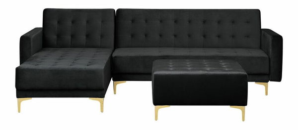 Táto veľká rohová pohovka s taburetom je ideálnym kusom nábytku do vašej obývacej izby. Vďaka nastaviteľnému operadlu ju možno jednoducho rozložiť na pohodlnú posteľ pre dve osoby. Ležadlo môže byť umiestnené na pravej alebo ľavej strane. Táto pohovka je celá čalúnená vysokokvalitnou a štýlovou čiernou zamatovou látkou s elegantným prešívaním a ponúka funkčnosť i nadčasový štýl. Je dobrou voľbou do moderných, ale aj tradične zariadených interiérov. Stabilitu pohovky zaručujú kovové nohy.