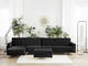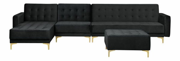 Táto veľká rohová pohovka s taburetom je ideálnym kusom nábytku do vašej obývacej izby. Pozostáva z trojmiestnej a jednomiestnej pohovky a ležadla. Vďaka nastaviteľnému operadlu ju možno jednoducho rozložiť na pohodlnú posteľ pre dve osoby. Ležadlo môže byť umiestnené na pravej alebo ľavej strane. Táto pohovka je celá čalúnená vysokokvalitnou a štýlovou čiernou zamatovou látkou s elegantným prešívaním a ponúka funkčnosť i nadčasový štýl. Je dobrou voľbou do moderných, ale aj tradične zariadených interiérov. Stabilitu pohovky zaručujú kovové nohy.
