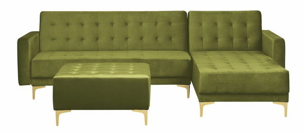 Táto veľká rohová pohovka s taburetom je ideálnym kusom nábytku do vašej obývacej izby. Vďaka nastaviteľnému operadlu ju možno jednoducho rozložiť na pohodlnú posteľ pre dve osoby. Ležadlo môže byť umiestnené na pravej alebo ľavej strane. Táto pohovka je celá čalúnená vysokokvalitnou a štýlovou zelenou zamatovou látkou s elegantným prešívaním a ponúka funkčnosť i nadčasový štýl. Je dobrou voľbou do moderných, ale aj tradične zariadených interiérov. Stabilitu pohovky zaručujú kovové nohy.