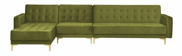 Táto veľká rohová pohovka je ideálnym kusom nábytku do vašej obývacej izby. Pozostáva z trojmiestnej a jednomiestnej pohovky a ležadla. Vďaka nastaviteľnému operadlu ju možno jednoducho rozložiť na pohodlnú posteľ pre dve osoby. Ležadlo môže byť umiestnené na pravej alebo ľavej strane. Táto pohovka je celá čalúnená vysokokvalitnou a štýlovou zelenou zamatovou látkou s elegantným prešívaním a ponúka funkčnosť i nadčasový štýl. Je dobrou voľbou do moderných, ale aj tradične zariadených interiérov. Stabilitu pohovky zaručujú kovové nohy.