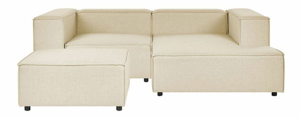 Vylepšite svoju obývaciu izbu a urobte z nej štýlovú a dobre usporiadanú miestnosť pomocou tejto modernej pohovky. Má veľmi kvalitné a odolné čalúnenie z polyesterového ľanu. Vďaka nohám zo syntetického materiálu je navyše stabilná. Pohovka pozostáva z dvoch modulov a taburetu. Všetky časti možno spojiť a vytvoriť sedaciu zostavu alebo ich použiť samostatne. Táto pohovka ponúka funkčnosť a nadčasový štýl a vďaka elegantnému dizajnu a jednoduchému prevedeniu v neutrálnej farbe dokonale doplní interiér zariadený v modernom a boho štýle.