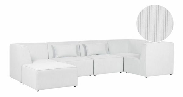 Vytvorte si štýlovú obývaciu izbu s touto modernou pohovkou. Menčestrové čalúnenie je mäkké na dotyk a vyznačuje sa nápadnou vrúbkovanou textúrou, vďaka ktorej vyzerá elegantne. Stabilitu pohovky zaručujú nohy vyrobené zo syntetického materiálu. Rohová pohovka sa skladá z 5 modulov, ktoré možno spojiť do jedného celku alebo použiť samostatne a vytvoriť iné usporiadanie. Súčasťou pohovky je aj viacúčelová taburetka, ktorá môže poslúžiť ako miesto na sedenie, podnožka alebo stolík. Dodatočné vankúše majú snímateľné poťahy pre jednoduchšie čistenie.