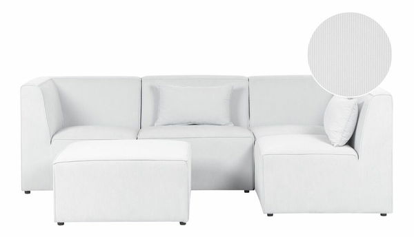 Vytvorte si štýlovú obývaciu izbu s touto modernou pohovkou. Menčestrové čalúnenie je mäkké na dotyk a vyznačuje sa nápadnou vrúbkovanou textúrou, vďaka ktorej vyzerá elegantne. Stabilitu pohovky zaručujú nohy vyrobené zo syntetického materiálu. Rohová pohovka sa skladá zo 4 modulov, ktoré možno spojiť do jedného celku alebo použiť samostatne a vytvoriť iné usporiadanie. Súčasťou pohovky je aj viacúčelová taburetka, ktorá môže poslúžiť ako miesto na sedenie, podnožka alebo stolík. Dodatočné vankúše majú snímateľné poťahy pre jednoduchšie čistenie.