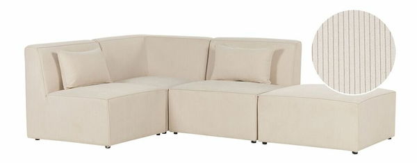 Vytvorte si štýlovú obývaciu izbu s touto modernou pohovkou. Menčestrové čalúnenie je mäkké na dotyk a vyznačuje sa nápadnou vrúbkovanou textúrou, vďaka ktorej vyzerá elegantne. Stabilitu pohovky zaručujú nohy vyrobené zo syntetického materiálu. Rohová pohovka sa skladá z 3 modulov, ktoré možno spojiť do jedného celku alebo použiť samostatne a vytvoriť iné usporiadanie. Súčasťou pohovky je aj viacúčelová taburetka, ktorá môže poslúžiť ako miesto na sedenie, podnožka alebo stolík. Dodatočné vankúše majú snímateľné poťahy pre jednoduchšie čistenie.