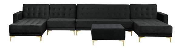 Modulárna sedacia súprava v tvare U s taburetom je ideálnym a skutočne univerzálnym kusom nábytku do vašej obývacej izby. Súprava pozostáva z 3-miestnej pohovky, 1-miestnej sedacej časti a dvoch bočných ležadiel a vďaka nastaviteľnému operadlu ju možno jednoducho zmeniť na pohodlné lôžko. Táto súprava je celá čalúnená vysokokvalitnou a štýlovou čiernou zamatovou látkou s elegantným prešívaním a ponúka funkčnosť i nadčasový štýl. Celá zostava je stabilná vďaka kovovým nohám.