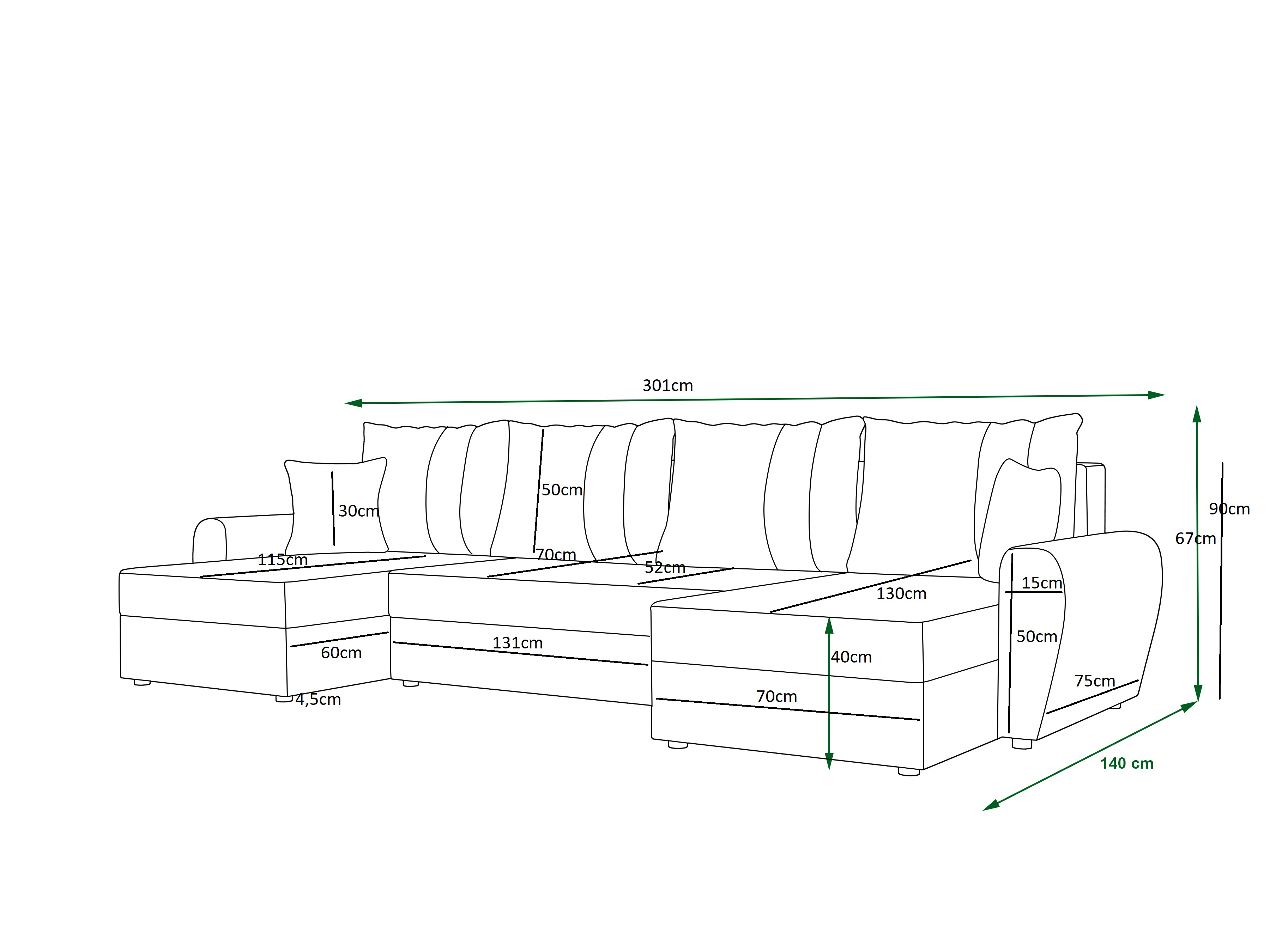 Vďaka kvalitnej konštrukcii z dreveného rámu a drevotriesky je sedačka pevná a odolná, zatiaľ čo pena T30 v sedákoch zabezpečuje pohodlné sedenie aj ležanie. Praktickým bonusom je rozkladacia funkcia s plochou spania 270x130 cm, ktorá umožní pohodlný odpočinok pre hostí.