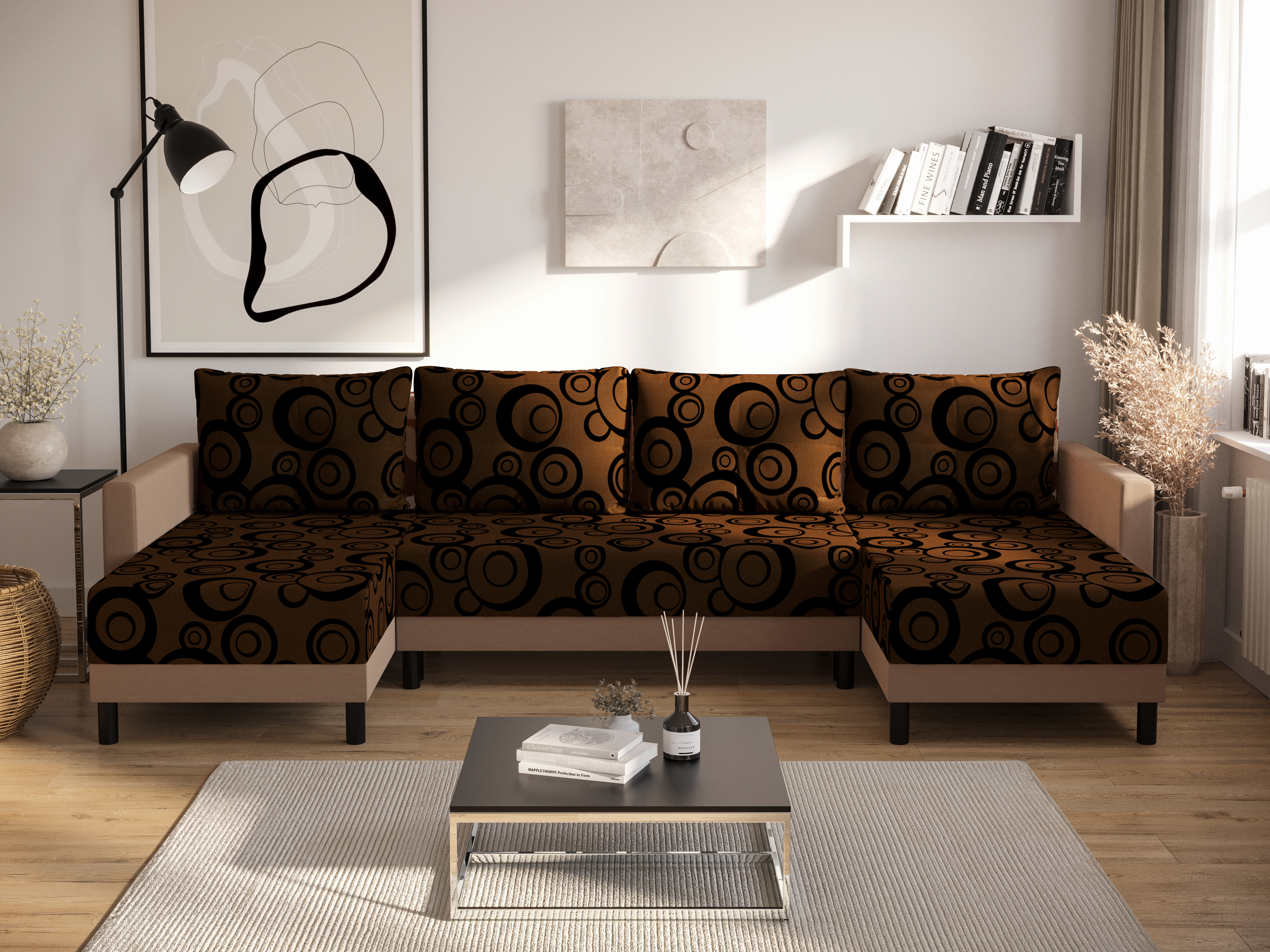 Rohová sedacia súprava U-Glimmer U v kombinácii svetlohnedej, tmavohnedej a čiernej farby prináša do vášho interiéru nielen štýlový vzhľad, ale aj maximálny komfort. Vďaka pevnej konštrukcii z dreveného rámu a drevotriesky je táto sedacia súprava odolná a stabilná, čo zaručuje dlhodobé používanie.