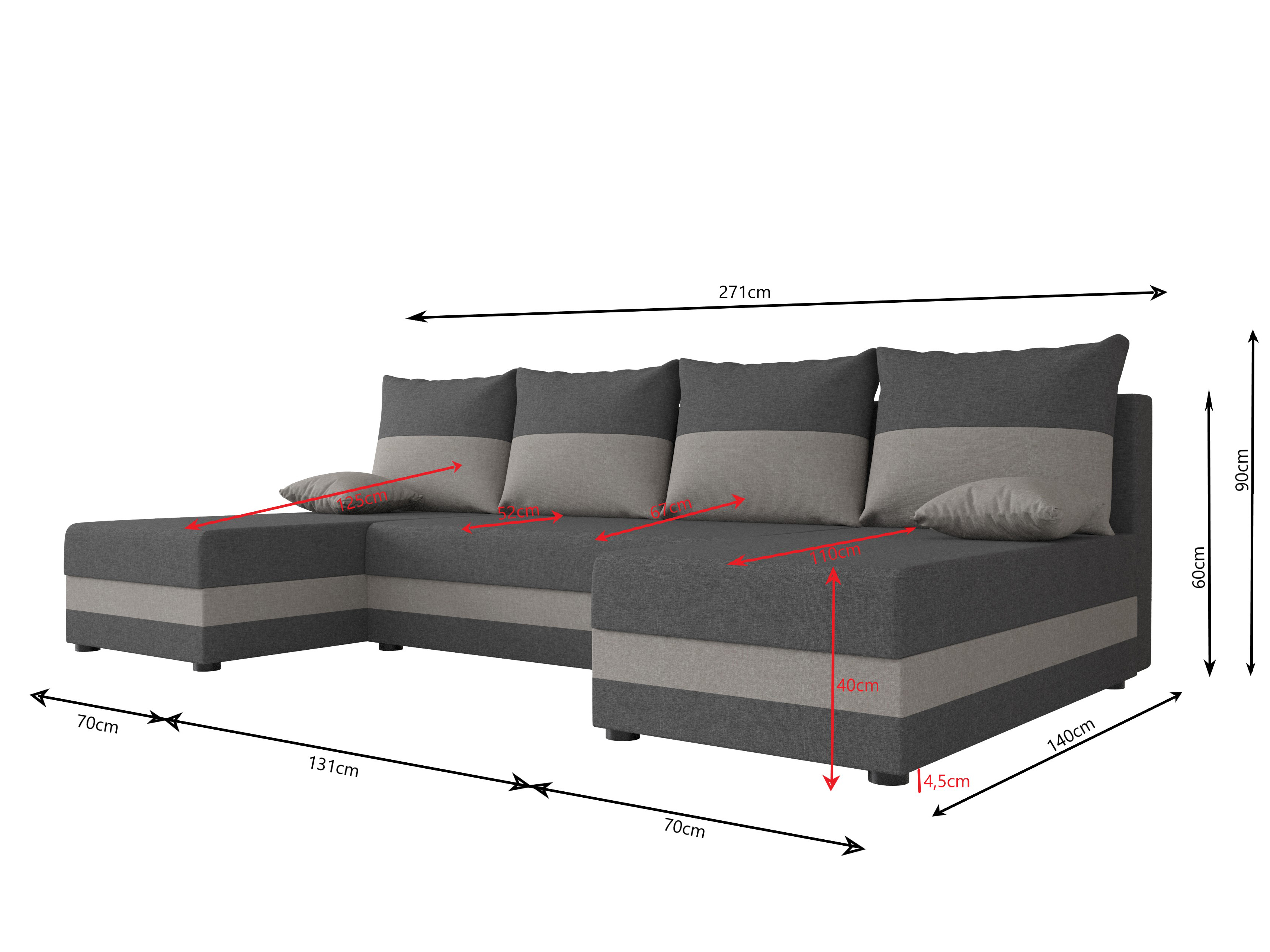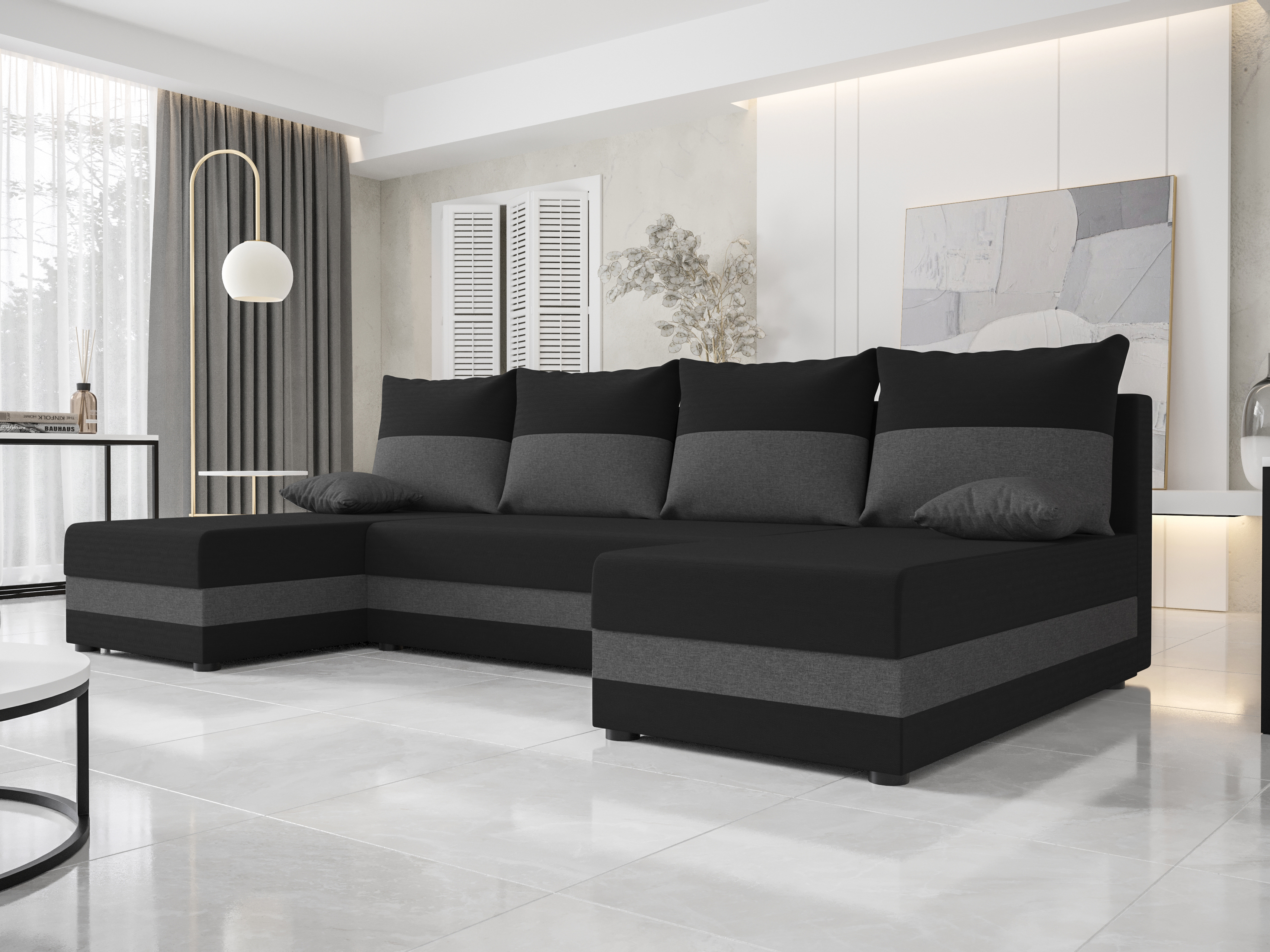 Rohová sedacia súprava U - Harmony U v kombinácii čiernej a sivej farby je ideálnym riešením pre moderné obývacie izby, ktoré ocenia praktickosť aj štýlový dizajn. Vďaka pevnej konštrukcii z dreveného rámu a drevotriesky je táto sedacia súprava mimoriadne odolná a zaručuje dlhodobé používanie bez straty kvality. Stredne tvrdá pena T30 spolu s falistou pružinou poskytujú optimálnu oporu a pohodlie pri sedení, zatiaľ čo množstvo vankúšov z brúsené PUR peny zabezpečuje príjemný relax a oporu chrbta.