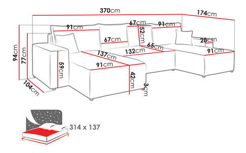 ZobraziťSedacia súprava je ideálnou voľbou pre tých, ktorí hľadajú pohodlie a štýl. Objavte rohovú pohovku Maryn U s funkciou spánku! Tento jedinečný kus nábytku má mnoho inovatívnych funkcií, vďaka ktorým bude vaša obývačka miestom bezkonkurenčného pohodlia a štýlu. Hlavnou prednosťou modelu je priestor na spanie, ktorý umožňuje jeho jednoduchú a pohodlnú premenu na praktickú posteľ. Ale to nie je koniec! Vďaka automatickému rozkladaciemu stroju DL sa proces prestavby stáva ešte intuitívnejším a výnimočne jednoduchým. Len pár chvíľ stačí na to, aby ste si užili plnohodnotné miesto na oddych či spánok. Rohová sedačka má tiež úložný priestor na lôžkoviny umiestnený vo vnútri nábytku. Vďaka tomu je ukladanie paplónov a vankúšov jednoduché a pohodlné. Operadlo má podobu pohyblivých vankúšov, ktoré nielenže poskytujú pohodlie, ale umožňujú vám ich prispôsobiť si podľa vlastných preferencií. Môžete si ich usporiadať podľa svojich preferencií a vytvoriť tak dokonalé miesto na oddych. Ešte by sme mali spomenúť, že ide o samostatne stojacu rohovú sedačku, to znamená, že jej chrbát je potiahnutý látkou. Vďaka tomu je možné nábytok ľubovoľne umiestniť kdekoľvek v obývačke, bez toho, aby ste sa museli prilepiť na stenu. Táto funkcia vám poskytuje väčšiu flexibilitu pri navrhovaní interiéru. Rozmery: dĺžka: 370 cm, šírka: 181 cm výška: 94 cm, plocha na spanie: Rozmery: 314 x 137 cm, rozmery kontajnera: dĺžka: 128 cm, šírka: 68 cm, výška: 24 cm Rohová strana: univerzálna Prevedenie: Rám: borovicové drevo + 16 mm hrubá drevotrieska, sedadlo a operadlo: pena T25 + vlnitá pružina typu A, rohová pohovka je rozkladacia, automatické uľahčenie rozkladania, typ DL, funkcia spania, úložný priestor, čierne plastové nohy, operadlo vo forme pohyblivých vankúšov, vankúše plnené granulátom, zapínanie na zips, Rohová pohovka je voľne stojaca (zadná časť je čalúnená látkou). Záruka: 24 mesiacov