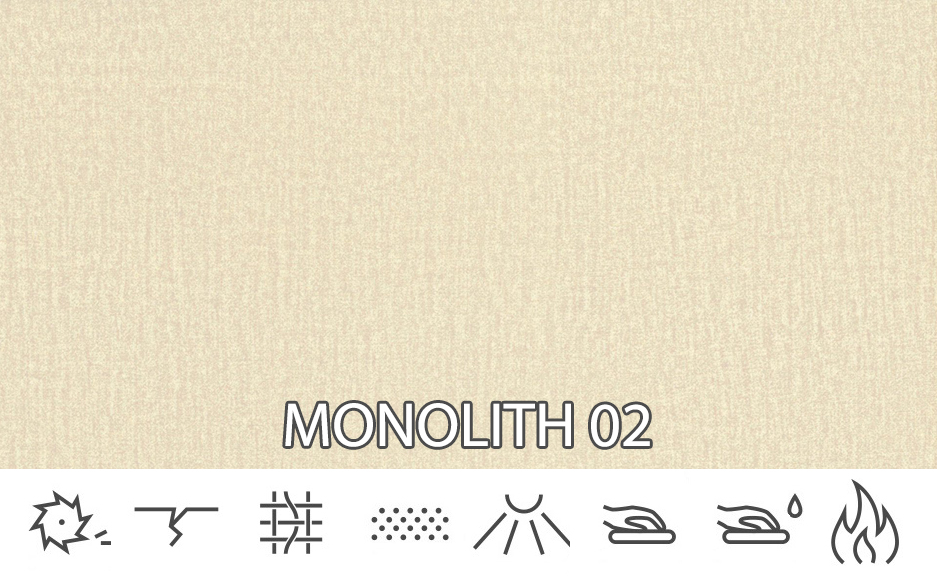 Monolith je odolná plyšová látka, ktorá je príjemná na dotyk. Je pokrytá špeciálnou ochrannou vrstvou, ktorá vytvára hydrofóbnu vrstvu, ktorá chráni pred rýchlym vstrebaním rozliatych tekutín. Je vysoko odolná proti vyblednutiu a žmolkovaniu. Látka sa vyznačuje tieňovaním materiálu. Možno ju čistiť prostriedkami na ošetrovanie čalúnenia. Nemala by sa bieliť a vystavovať nadmerne vysokým teplotám – nesušiť v sušičke. Gramáž: 330g m2. Zloženie: 100% PES.
