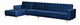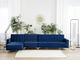 Táto veľká rohová pohovka je ideálnym kusom nábytku do vašej obývacej izby. Pozostáva z trojmiestnej a jednomiestnej pohovky a ležadla. Vďaka nastaviteľnému operadlu ju možno jednoducho rozložiť na pohodlnú posteľ pre dve osoby. Ležadlo môže byť umiestnené na pravej alebo ľavej strane. Táto pohovka je celá čalúnená vysokokvalitnou a štýlovou modrou zamatovou látkou s elegantným prešívaním a ponúka funkčnosť i nadčasový štýl. Je dobrou voľbou do moderných, ale aj tradične zariadených interiérov. Stabilitu pohovky zaručujú kovové nohy.
