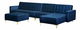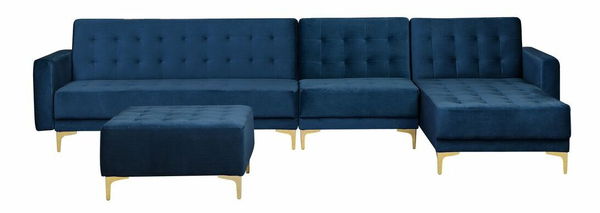 Táto veľká rohová pohovka s taburetom je ideálnym kusom nábytku do vašej obývacej izby. Pozostáva z trojmiestnej a jednomiestnej pohovky a ležadla. Vďaka nastaviteľnému operadlu ju možno jednoducho rozložiť na pohodlnú posteľ pre dve osoby. Ležadlo môže byť umiestnené na pravej alebo ľavej strane. Táto pohovka je celá čalúnená vysokokvalitnou a štýlovou modrou zamatovou látkou s elegantným prešívaním a ponúka funkčnosť i nadčasový štýl. Je dobrou voľbou do moderných, ale aj tradične zariadených interiérov. Stabilitu pohovky zaručujú kovové nohy.