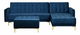 Táto veľká rohová pohovka s taburetom je ideálnym kusom nábytku do vašej obývacej izby. Vďaka nastaviteľnému operadlu ju možno jednoducho rozložiť na pohodlnú posteľ pre dve osoby. Ležadlo môže byť umiestnené na pravej alebo ľavej strane. Táto pohovka je celá čalúnená vysokokvalitnou a štýlovou modrou zamatovou látkou s elegantným prešívaním a ponúka funkčnosť i nadčasový štýl. Je dobrou voľbou do moderných, ale aj tradične zariadených interiérov. Stabilitu pohovky zaručujú kovové nohy.