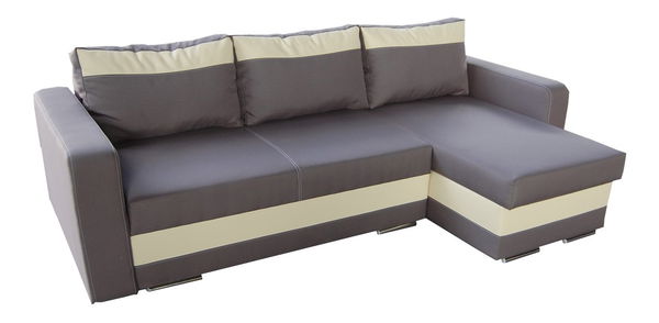 Moderná rohová sedačka vo farebnej kombinácii šedého šenilu a kreémovej ekokože s kontrastným šitím na sedení. Pružinové sedenie zabezpečuje pohodlie pri sedení. Rozložením vznikne plocha na prespanie. Má praktické dva úložné priestory. Sedačka je postavená na kovových nohách.