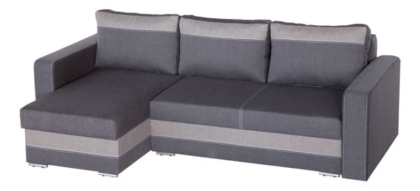 Moderná rohová sedačka v dvoch farebných odtieňoch šenilu Inari s kontrastným šitím na sedení. Pružinové sedenie zabezpečuje pohodlie pri sedení. Rozložením vznikne plocha na prespanie. Má praktické dva úložné priestory. Sedačka je postavená na kovových nohách.
