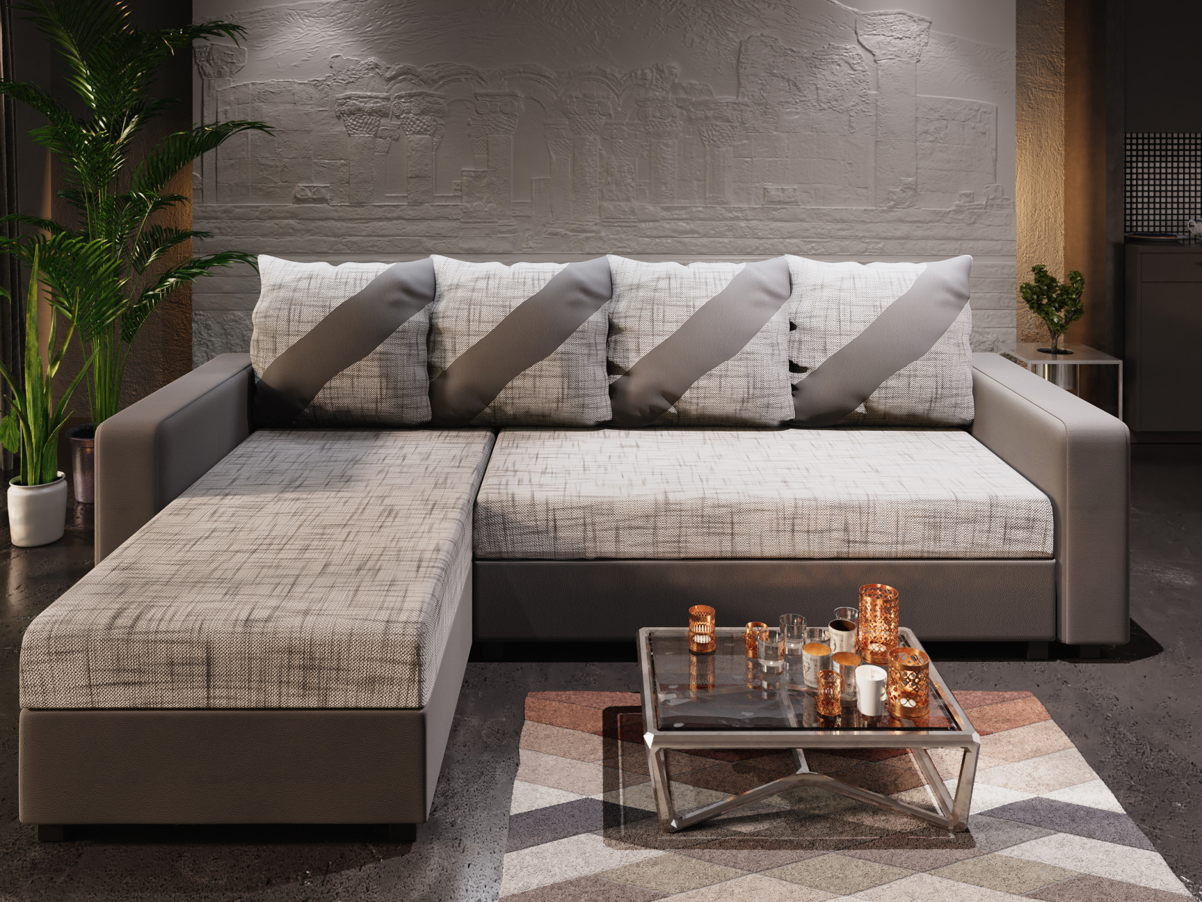Rohová sedačka Ardait (melírovaná svetlosivá + tmavosivá) má výšku 85-90 cm a hĺbku 144 cm. Táto moderná a štýlová sedačka má unikátny dizajn s štyrmi obojstrannými vankúšmi s rôznymi motívmi, ktoré môžete jednoducho otočiť a zmeniť tak vzhľad Vašej obývačky. Sedačka je ľahko rozložiteľná, poskytuje plochu na spanie 200x132 cm a disponuje aj úložným priestorom. Tkanina Kornet je husto tkaná látka so štruktúrou a melírovaným efektom, zložená z 90% polyesteru a 10% akrylu s gramážou 470g/m +/-5%. Tkanina Dolaro napodobňuje prírodnú kožu a je vhodná pre všetky typy čalúnenia. Sedačka má odolnú konštrukciu s pružinami faliste a penou PU T30 (8 mm). Rozkladací mechanizmus je automat a v cene sú štyri vankúše.