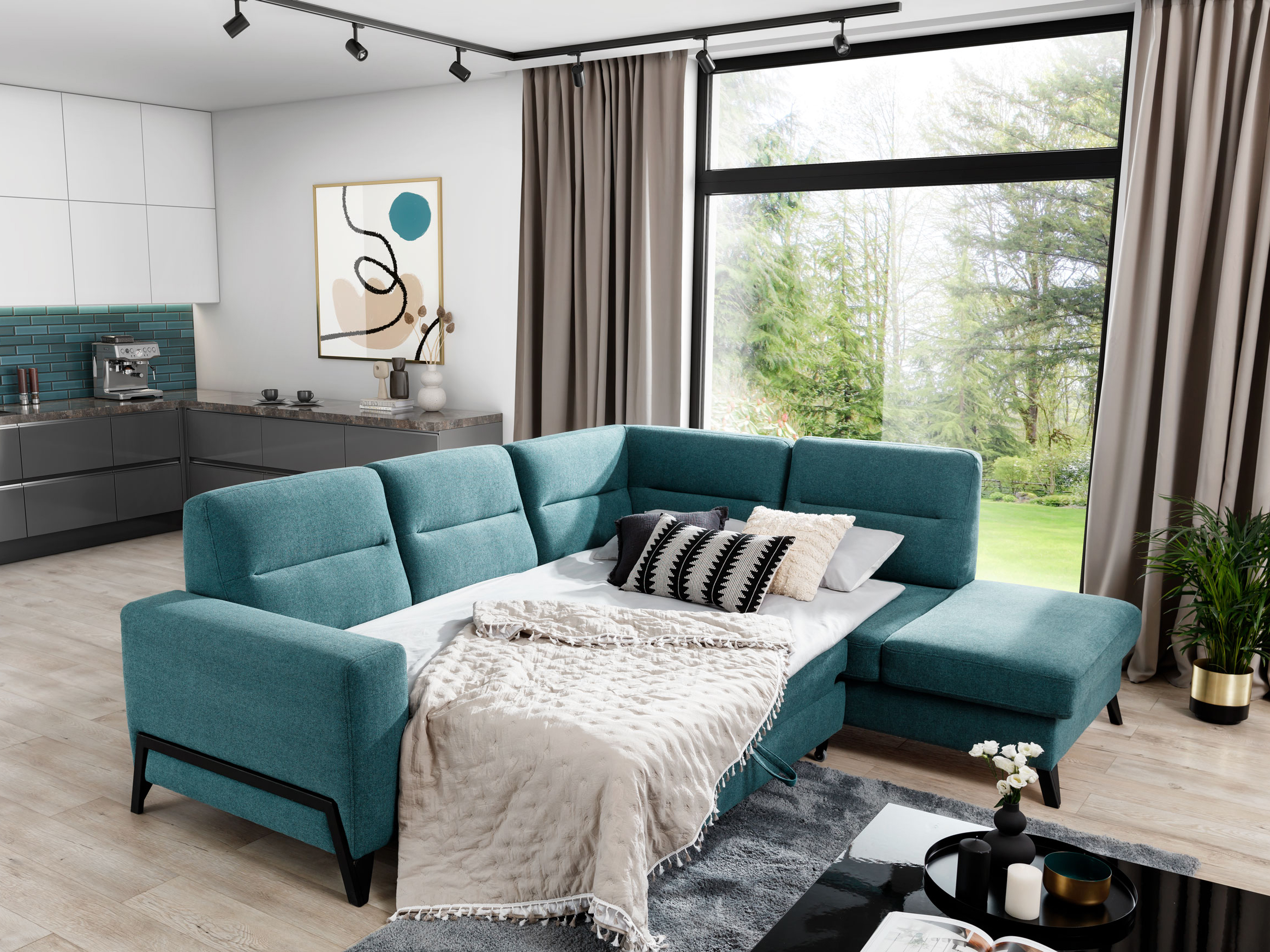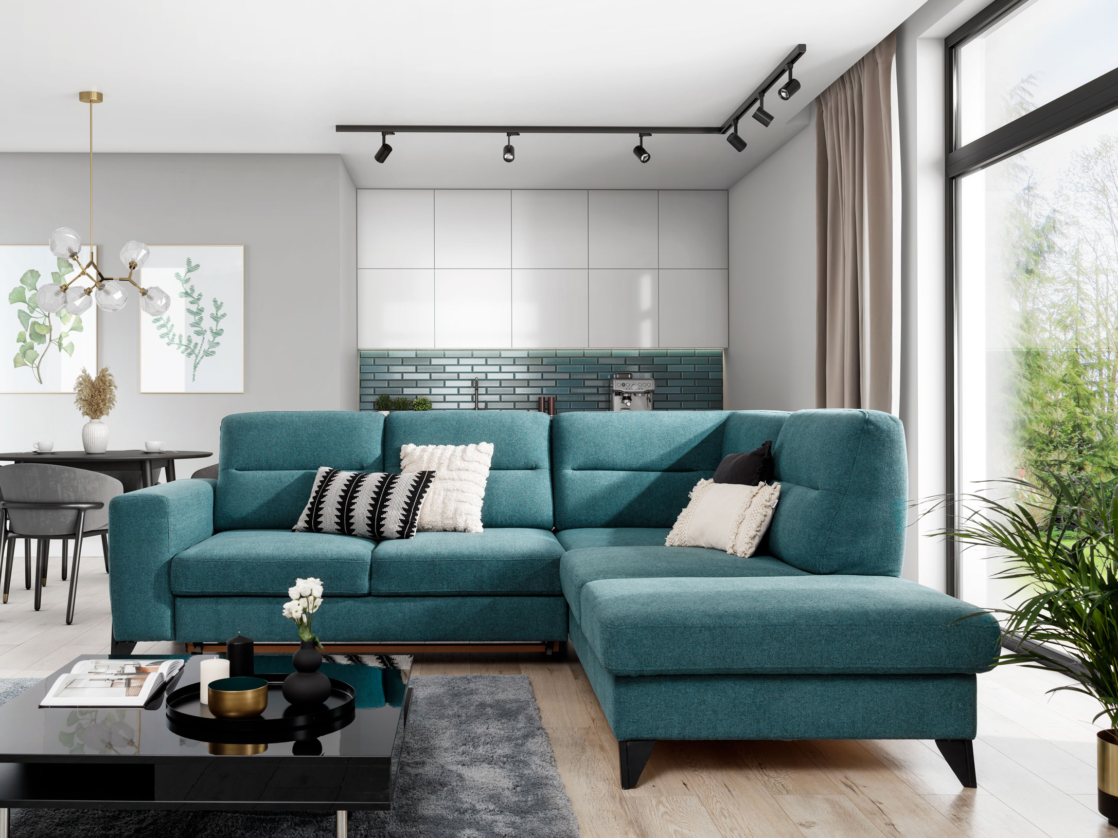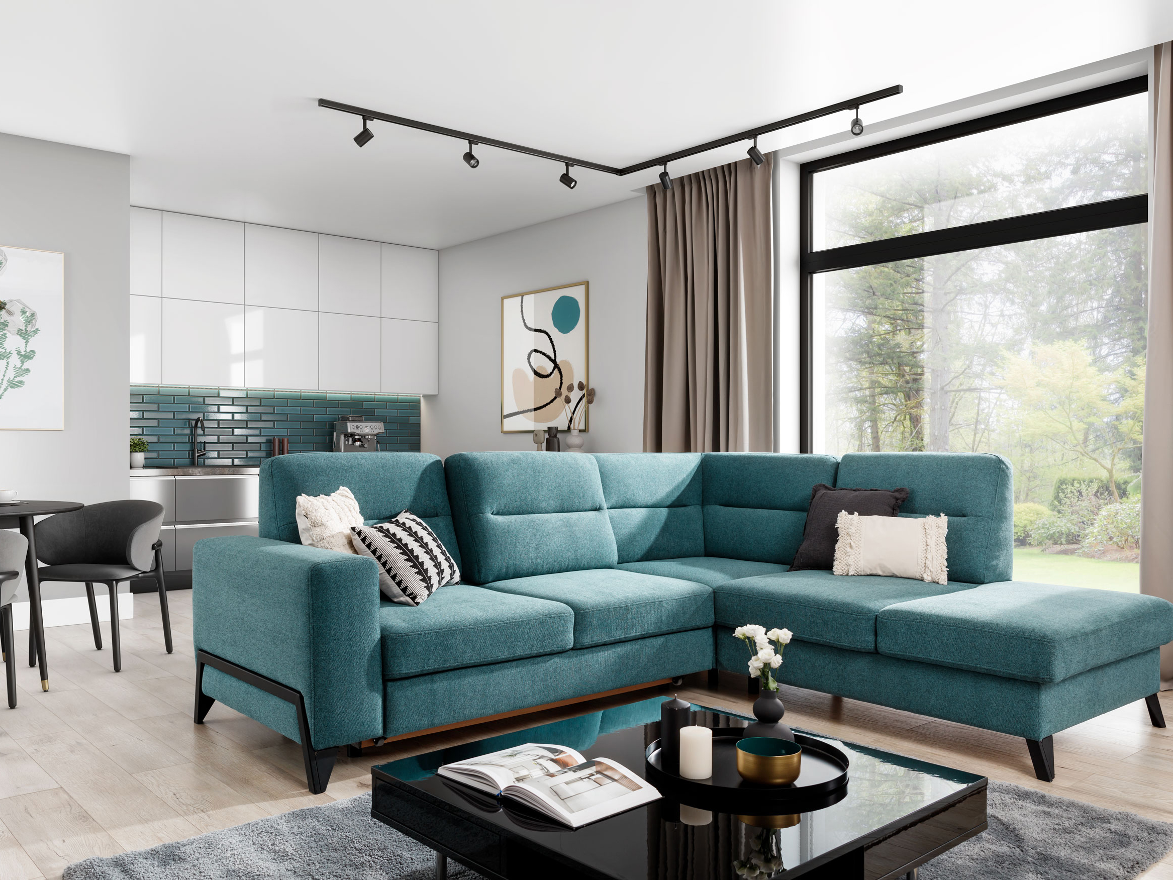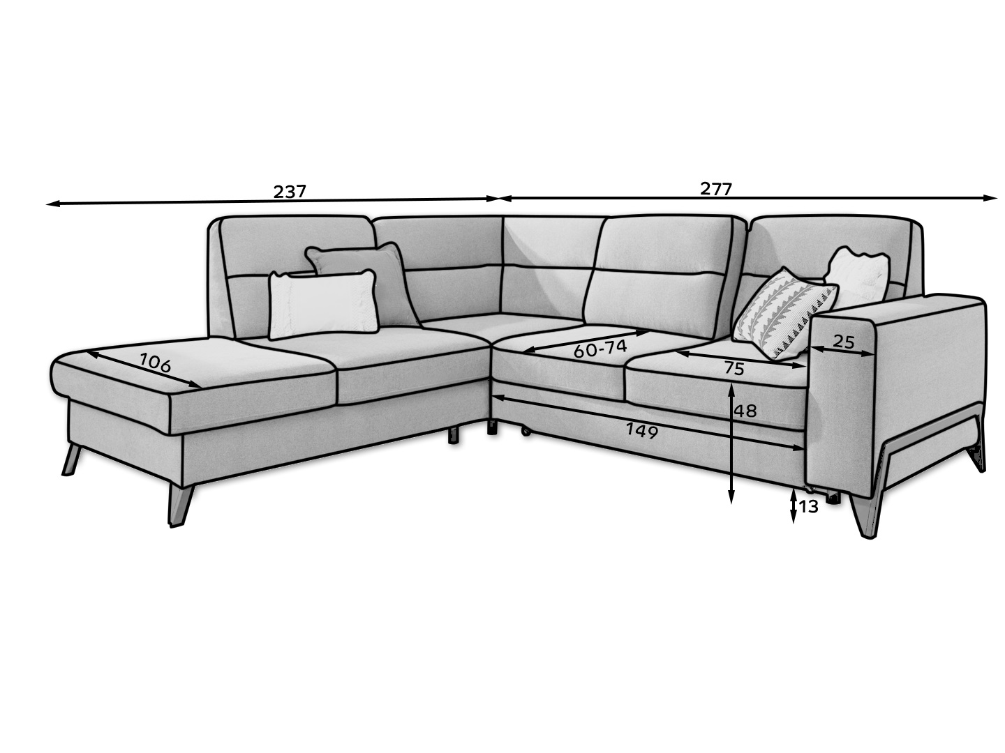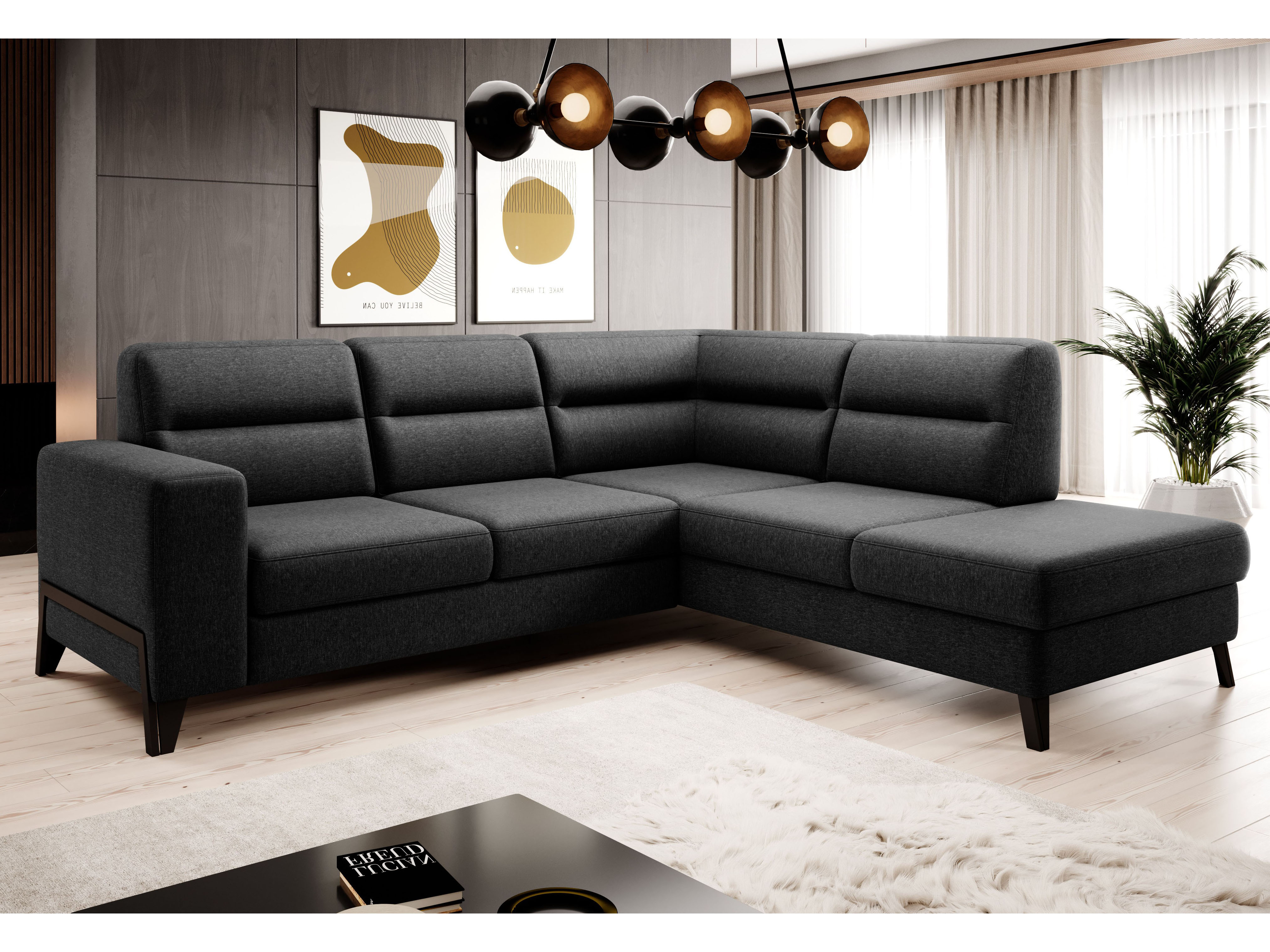 Rohová sedačka Clarice (čierna) (P) vás zahrnie pohodlným posedením v obývačke. Táto sedačka má rozmer výšky 100 cm a hĺbky 237 cm, a ponúka vám dostatok miesta na relaxáciu. Materiál borovica, polyester a vlnová pružina typu B. Sedačka má výplň HR 3035 a T2315, a môže sa rozložiť na plochu 215x130 cm pomocou vozíka. Taktiež poskytuje úložný priestor. Výška sedu je 48 cm a hĺbka sedu je 60-74 cm. Sedačka je 277 cm široká a hĺbka sedu je 237 cm. Nožičky sú vyrobené z ocele v čiernej farbe. Sedačka má čalúnenú zadnú stranu a je dodávaná v troch balíkoch. Rozmery balíka č. 1 sú 140x110x95 cm/95 kg, rozmery balíka č. 2 sú 105x105x110 cm/53 kg a rozmery balíka č. 3 sú 178x105x95 cm/50 kg.