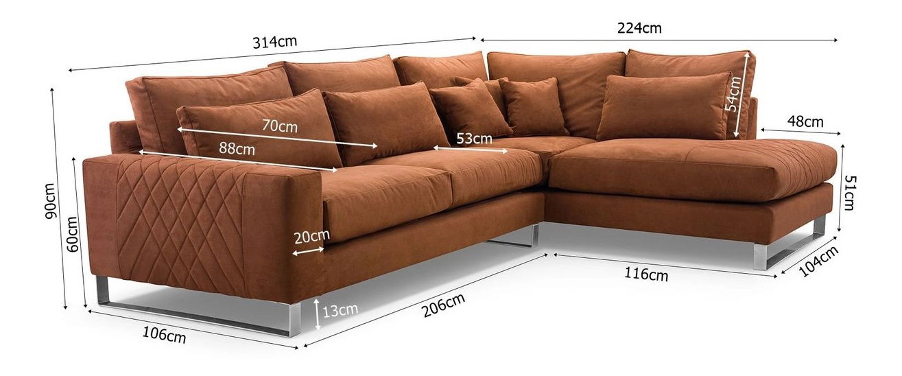 ZobraziťRohová sedačka Cristal je skvelým doplnkom pre vašu obývačku. Sede časti sú prešívané a elegantné. Táto sedacia súprava poskytuje dostatočné pohodlie a je k dispozícii v ľavom aj pravom prevedení. Tkanina Torre 13 je pevná a odolná. Konštrukciu tvorí drevotrieska a lamino doska, zatiaľ čo pružiny sú falisté. Výplň tvorí pena T-30 a nožičky sú kovové a chrómové. Sedačka nemá úložný priestor, no ponúka plochu na sedenie s hĺbkou 53 cm a výškou 51 cm. Rozkladací mechanizmus zabezpečuje vysoký komfort a rozmery balíkov sú 90 cm výška a 224 cm hĺbka pre prvý a druhý balík.