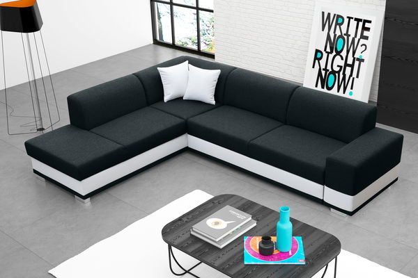 Moderná rohová sedačka v dvojfarebnom prevedení bude dizajnovým prvkom vo Vašej obývačke. Je čalúnená aj zo zadnej strany, tak ju môžete umiestniť aj do priestoru. Jednoduchým vytiahnutím spodnej časti získate praktický priestor na spanie. Nečakaní noclažníci majú kde zložiť hlavu. V otomane sa nachádza veľký úložný priestor, do ktorého môžete umiestniť posteľné prádlo alebo vankúše. Chromové nožičky elegantne dotvárajú celkový dizajn sedačky. Dva malé vankúšiky sú v cene sedačky.