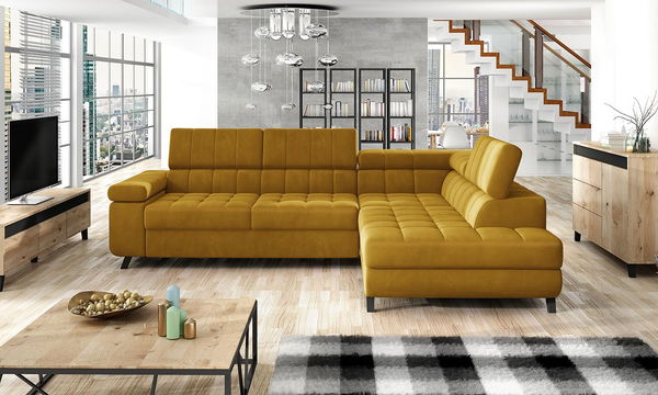 Štýl, ktorý odlišuje modernú rohovú sedačku Evrona, dokonale zapadá do interiéru elegantnej obývačky. Matné nohy robia zo sedačky rovnako pôsobivý vzhľad v podkroví, ako aj v priemyselnej obývacej izbe. Široká škála poťahových textílií obsahuje aj praktické návrhy materiálov odolných voči škvrnám, ako aj materiálov so zvýšenou odolnosťou proti poškriabaniu. Zvýšené pohodlie počas popoludňajšieho odpočinku na sedačke poskytuje mäkké nábytkové sedadlo podopreté pevnou konštrukciou, ako aj nastaviteľné opierky hlavy. Ich nastavenie sa dá úplne prispôsobiť tvaru, čím sa zvyšuje vaše pohodlie. Z hľadiska funkčnosti sa rohová pohovka ľahko rozloží a pripraví miesto na spanie pre seba alebo hostí jednoduchým vysunutím dlhšej časti sedadla. A čo viac, vnútri nábytku je úložný priestor na posteľnú bielizeň. Toto dômyselne skryté úložisko bude užitočné pre vankúše a prikrývky, ako aj miesto na ukladanie sezónneho oblečenia a iného zriedka používaného príslušenstva. Rohová sedačka v tvare „L“ je voľne stojací model, čo znamená, že jej chrbát je čalúnený látkou. Toto riešenie umožňuje akékoľvek usporiadanie nábytku v priestore - umiestnené dokonca aj v strede obývacej izby, bude to vyzerať skvele.