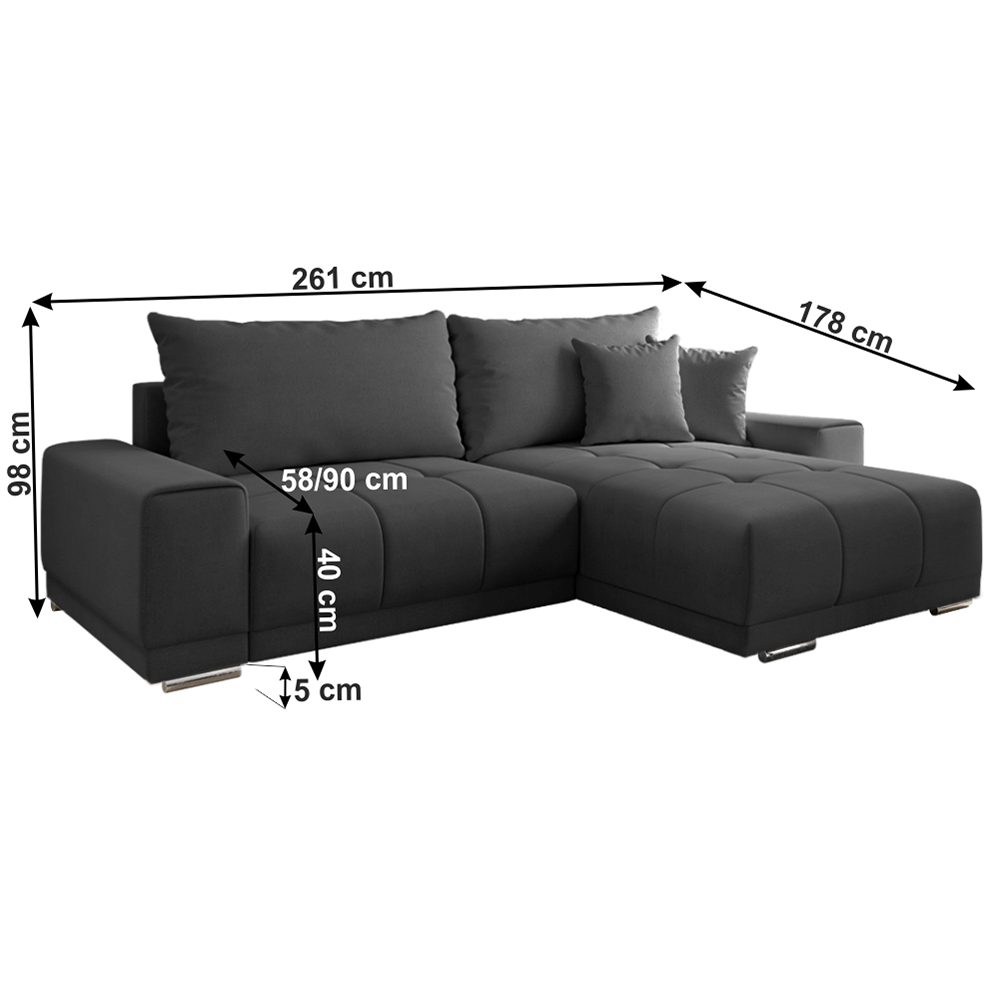 Rohová sedačka Fatinit (tmavosivá) s výškou 98 cm a hĺbkou 178 cm je ideálnym kúskom nábytku pre každý obývačkový priestor. Táto nadčasová sedačka disponuje možnosťou rozloženia, čím z nej vznikne plocha na spanie pre vašich hostí. Sedacia súprava je obohatená o dekoratívne vankúše, ktoré dodajú vašej izbe pohodlný a moderný vzhľad. Vnútri sedačky sa nachádza úložný priestor pre ukladanie vecí a poťahová látka je odolná voči opotrebeniu, takže si zachováva svoju krásu po dlhú dobu. Pri montáži môžete zvoliť stranu, ktorá sa najviac hodí do priestoru. Materiál poťahu je látka Soro a výplň tvorí pružina Faliste a Pur pena. Sedačka má rozmery plochy na spanie 203x148 cm, výšku sedu 40 cm a hĺbku sedu 58/90 cm. Vankúše majú rozmery 46x68 cm a nosnosť na jedno miesto je 90 kg. Sedacia súprava je dodávaná v demonte.