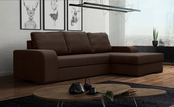 ZobraziťRohová sedačka Fonda (hnedá) (P) s výškou 90 cm a hĺbkou 165 cm je ideálna do obývačky alebo hosťovskej izby. Sedáčka má jednoduchý dizajn a rozkladací mechanizmus typu vozík, ktorý umožňuje pohodlné a rýchle rozloženie. Tkanina Portland 27 je testovaná na odolnosť a má vysoký počet cyklov odolnosti Martindale. Konštrukcia je vyrobená z dreveného materiálu s laminovanou doskou. Sedačka má falistú pružinu a výplň z peny typu T-30. Nožičky sú z tmavého orechového dreva. Sedačka má úložný priestor a rozmery pre spanie sú 220 x 140 cm. Sedačka je balená v dvoch balíkoch s celkovou hmotnosťou 160 kg.