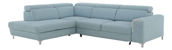Celočalúnená luxusná rohová sedačka s moderným dizajnom, ktorý podporujú chromové nožičky a polohovateľné záhlavie. Polohovateľné hlavové opierky zabezpečujú komfortné opretie chrbta a hlavy.