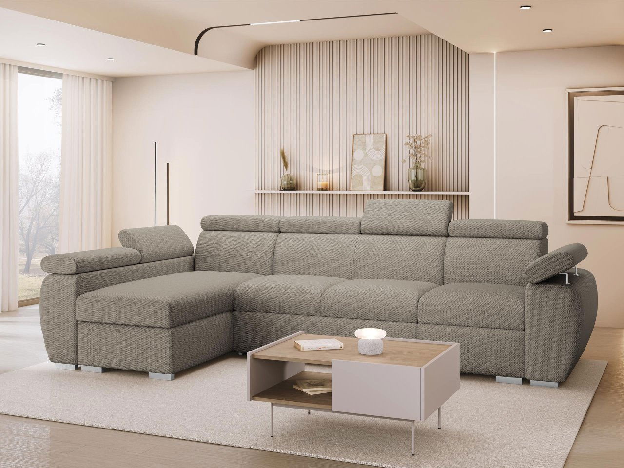 Rohová sedačka Gozo LCP do obývačky je moderný kus nábytku s elegantným dizajnom. Tlmené odtiene čalúnenia dodávajú interiéru sviežosť a nadčasový akcent, ktorý úspešne zapadne do aranžmánu, ktorý sa časom mení. Rohová sedačka s funkciou každodenného spánku sa skladá z niekoľkých segmentov vrátane časti s leňoškou umožňujúcou pohodlný relax. Má tiež nastaviteľné opierky hlavy, ktoré zvyšujú komfort používania, a široké, dobre polstrované podrúčky umožňujú pohodlné opretie rúk. Rohová sedačka je pomerne veľká, vhodná do priestranných obývačiek, kde sa môže stať centrálnym relaxačným bodom.