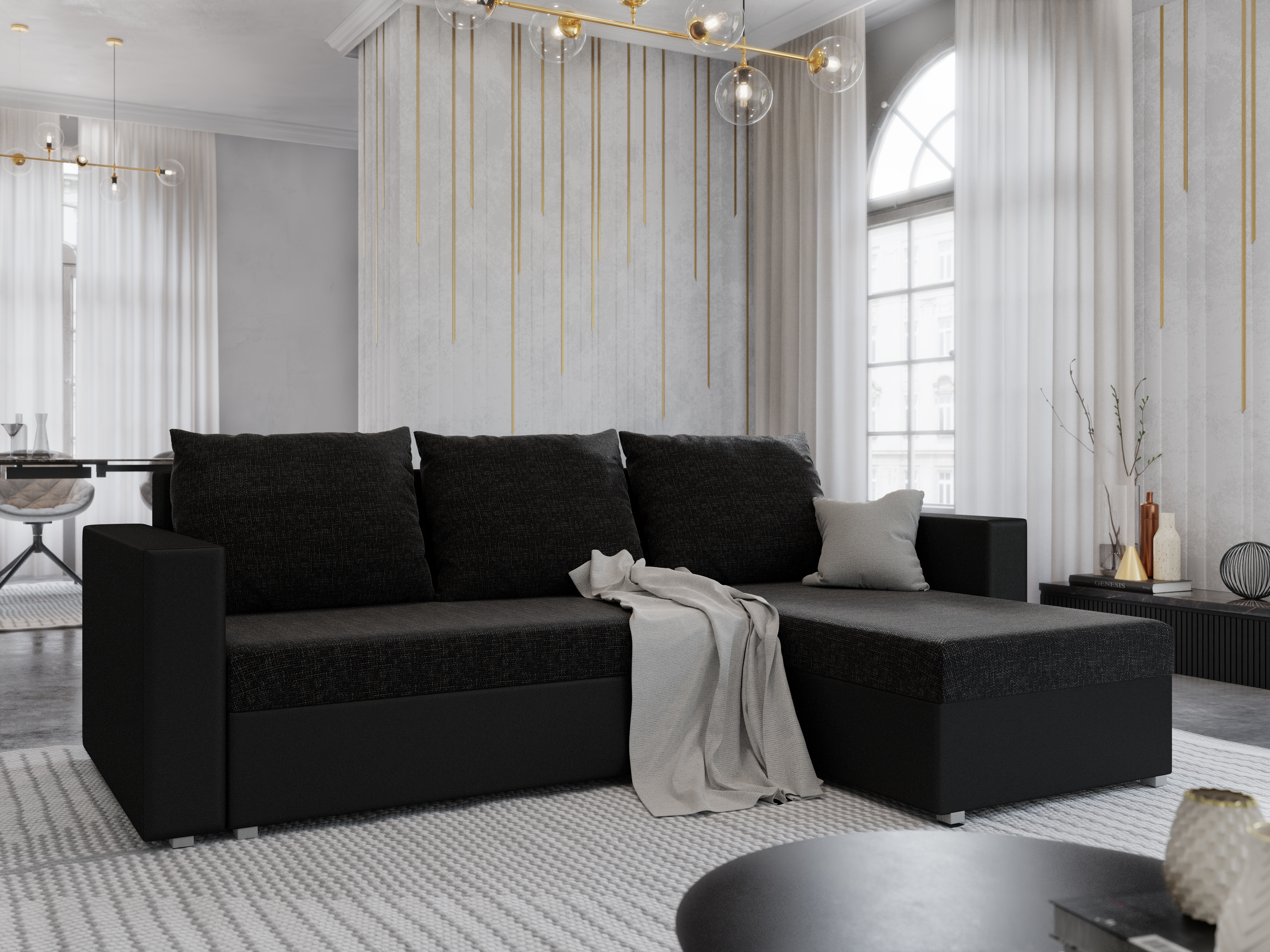 Rohová sedačka Hagoo (čierna) je pôvabný a funkčný kúsok nábytku, ktorý sa hodí do každej obývačky. Sedačka má elegantný chrbát a pevnú polyuretánovú penovú výplň T30, čo zaručuje vysoký komfort pri sedení a spánku. Sedačka je ľahko rozložiteľná a vytvára tak dostatok miesta na spanie. Súčasťou sú tri veľké vankúše so zipsom, ktoré uľahčujú ich čistenie. Nožičky sú vyrobené z kvalitného plastu. Vnútorný rám je vyrobený z dreva a drevotriesky. Sedačka má rozmery 85 x 152 cm a plochu na spanie 202 x 132 cm. Balenie obsahuje tri samostatné balíky s celkovou hmotnosťou 125 kg. Rohová sedačka Hagoo je skvelou voľbou pre tých, ktorí hľadajú moderne vyzerajúci a pohodlný nábytok do svojho interiéru.