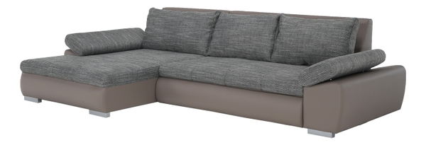 Elegantná rozkladacia rohová sedacia súprava Karma s moderným dizajnom. Podrúčky sedačky sú polohovateľné. Sedačka sa dá aj rozložiť a budete mať plochu na spanie. Korpus sedačky je z hnedej ekokože a sedenie z látky Berlin sivohnedej farby.