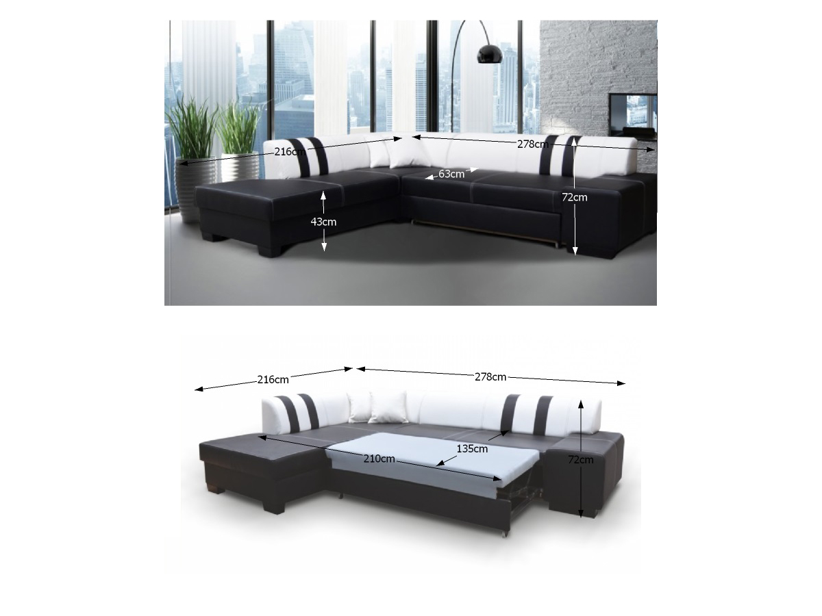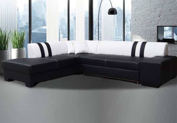 Luxusná rohová sedačka čalúnená kvalitnou ekokožou bude moderným prvkom vo Vašej obývacej izbe. Jej kontrastné dvojfarebné prevedenie bude skvele ladiť s ostatným nábytkom v miestnosti. Čierna ekokoža je vkusne prešitá bielou niťou. Sedačka má funkciu rozkladu, čím vznikne plocha na príležitostné spanie. Do úložného priestoru tak viete umiestniť napríklad posteľné prádlo.