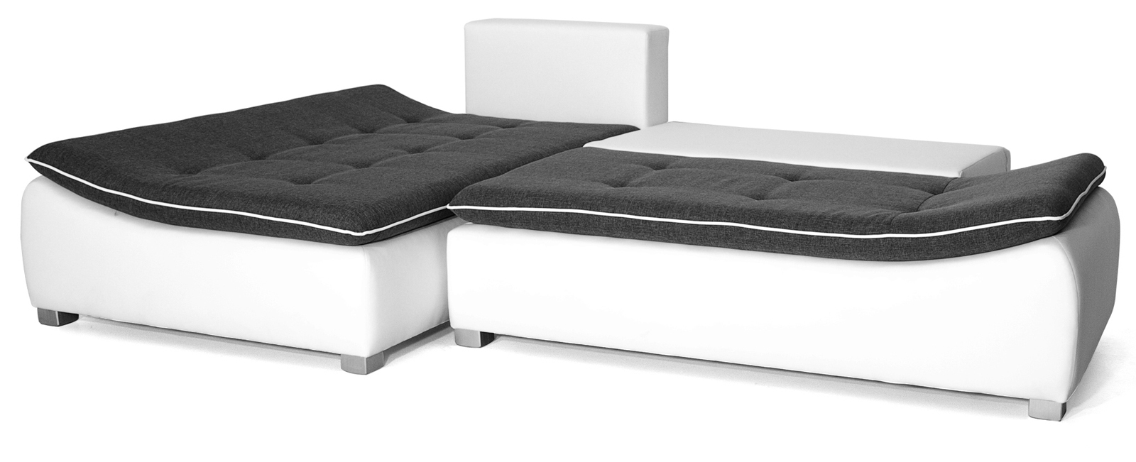 Moderná rohová sedačka Single Bis pôsobí veľmi elegantne a skvele zapadne k ostatnému nábytku v obývacej izbe. Je vyrobená z kvalitnej koženky bielej farby. Matrace sú v kontraste čiernej farby a vyrobené sú z kvalitného šenilu. Po obvode sú prešité bielym pruhom. Sedačka obsahuje systém automat, čo zaručuje rýchle a jednoduché rozloženie. To využijete ak chcete na sedačke prespať. Posteľné prádlo môžete skladovať priamo v sedačke v úložnom priestore.