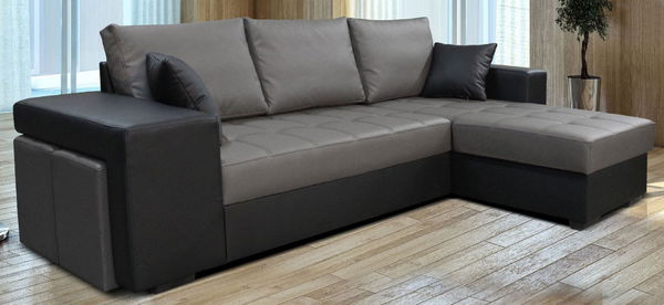 Praktická rohová sedačka, ktorá obsahuje úložný priestor a plochu na príležitostné spanie. Rozkladá sa pomocou klasického vozíka, ktorý sa vysunie a vytiahne sa z neho matrac na ráme. Pohodlné sedenie zaručuje PUR pena v kombinácii s vlnovcovými pružinami. Pod opierkami na ruky sa nachádzajú dve taburetky. Tie sú v cene sedačky, ako aj dva malé vankúšiky. Je čalúnená látkou v kombinácii s koženkou.