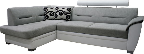 Moderná rohová sedačka dokonale zapadne medzi ostatný nábytok Vašej obývacej izby. Je čalúnená koženkou bielej farby, pričom sedacia časť je sivá látka. Rozložením získate plochu na prenocovanie. Posteľné prádlo nájde svoje miesto v úložnom priestore. Na operadle je umiestnená výškovo nastaviteľná opierka hlavy, pre zvýšenie pohodlia pri sedení.