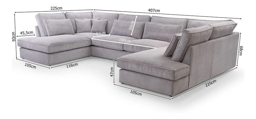 Rohová sedačka U Cabrio (sivá) (P) výška 93 cm hĺbka 225 cm Lincoln 86 je vyrobená pre milovníkov minimalistického nábytku a moderne zariadených interiérov. Cabrio kombinuje výnimočné pohodlie s eleganciou doplnenou o jedinečné dekoratívne prvky, ako sú jemné prešívanie, štýlové plastové nožičky, borovicové drevo a ozdobné vankúše s zipsom. Tento model rohovej sedačky má čalúnený materiál najvyššej kvality a 8 chrbtových vankúšov, 2 stredné vankúše a 6 dekoratívnych vankúšov sú už zahrnuté v cene. Rohovú sedačku Cabrio je možné ľubovoľne upravovať výberom zladených alebo kontrastných farieb materiálu a je k dispozícii aj v iných farebných prevedeniach. Konštrukcia sedačky je vyrobená z ihličnatého dreva, borovicového, bukového dreva a drevotriesky a výplň sedadiel obsahuje vlnitú pružinu a hustotu peny T30. Rohová sedačka Cabrio sa dodáva s čiernymi plastovými nožičkami, ktoré sú upevnené skrutkami a nie je potrebná montáž. Sedačka nemá funkciu rozkladania a ani úložný priestor.