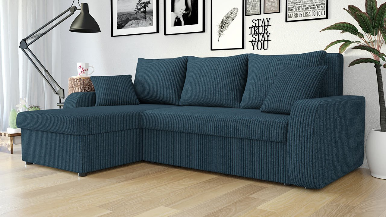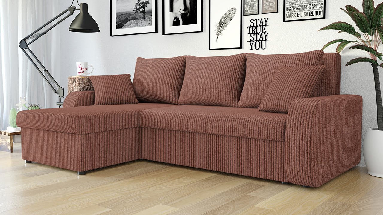 Tento model ponúka rozkladaciu plochu na spanie s rozmermi 268 x 130 cm, čo je vhodné pre hostí alebo menšie byty, kde je potrebné šetriť priestor. Tri úložné boxy pod sedákmi poskytujú dostatok miesta na uskladnenie posteľnej bielizne či sezónnych doplnkov, čím pomáhajú udržať poriadok v domácnosti. Súčasťou sú štyri veľké a dva menšie vankúše na zips, ktoré slúžia ako pohodlné operadlo a umožňujú jednoduchú údržbu.