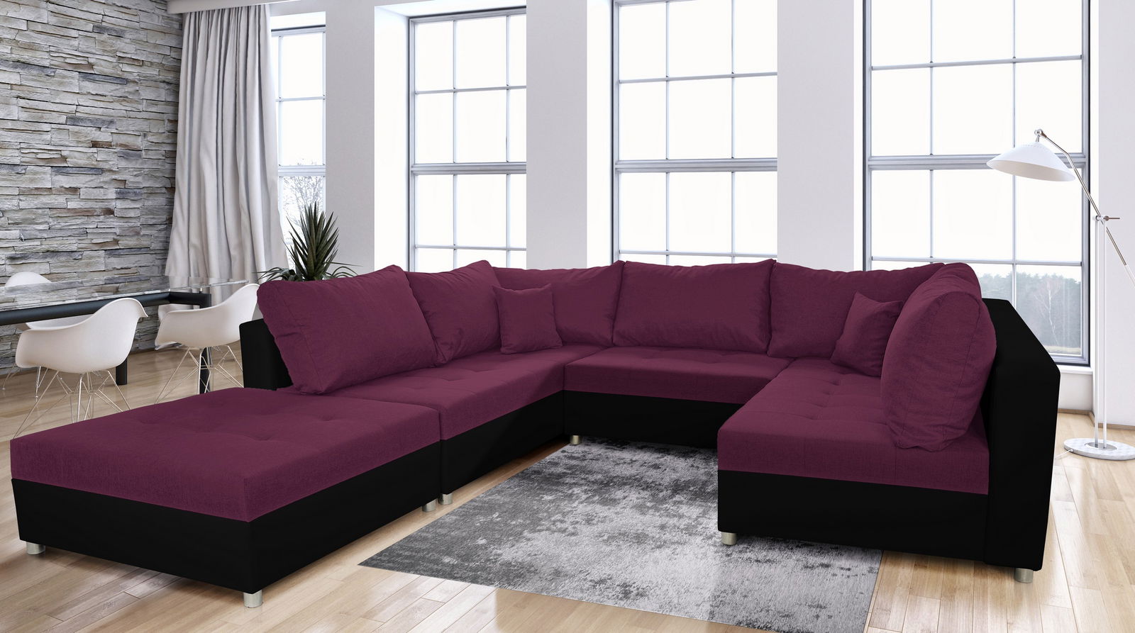 ZobraziťRohová sedačka U Deron s taburetkou v fialovej a čiernej farbe je ideálnou voľbou pre pohodlie a štýl v obývacej izbe. Celá rodina nájde miesto na tejto pohodlnej písané U sedačke, ktorá je čalúnená ekokožou na zadnej časti, čo umožňuje jej umiestnenie do akéhokoľvek miesta v miestnosti. Výplň sedadla spočíva v kombinácii vlnitej pružiny a vysoko pružnej peny T2844, ktorá zabezpečuje dokonalé pohodlie. Sedačka sa rýchlo a jednoducho zmení na spálňový nábytok, rozmery na spanie sú 275x110 cm, resp. 275x180 cm po zatlačení najdlhšej časti. Veľké zadné vankúše sú ergonomicky prispôsobené vašej postave a zabezpečujú pohodlný odpočinok. Konštrukcia je vyrobená z celodreveného rám, výplň pozostáva z polyuretánovej peny 28 kg/m³ a falistých pružín. Sedačka má sedačnú výšku 39 cm, hĺbku sedenia s vankúšmi 53 cm a bez vankúšov 81 cm. Výška sedačky bez vankúšov je 65 cm a počet vankúšov sú 7 veľkých a 2 malé. Sedačka má aj úložný priestor a je možné ju rozložiť. Tkaninou, ktorou je sedačka potiahnutá, je Sawana, ktorá je odolná a má jemnú štruktúru. Gramáž tkaniny je 340g/m a jej zloženie je 100% polyester. Test oderuvzdornosti Martindale je 45 000 cyklov. Ekokoža Dolaro je na báze PES a má viditeľnú a klasickú textúru, ktorá pripomína pravú kožu. Je ľahko čistiteľná a k dispozícii v širokej škále farieb. Jej zloženie je 18% polyester a 82% PCV. Gramáž tkaniny je 620g/m +/-60 %. Sada je rozdelená do 4 balíkov.