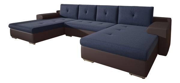 Moderná rohová sedačka v tvare U s názvom Marlon v modro-hnedom prevedení určite poteší aj toho najnáročnejšieho zákazníka. Sedačka s rozmermi výška 78 cm a hĺbka 181 cm má pôsobivú dvojfarebnú kombináciu tkaniny a ekokože, ktorá dodáva sedačke šmrnc. Pre pohodlné sedenie sú k dispozícii štyri veľké vankúše a široké opierky rúk, ktoré môžu poslúžiť ako odkladací priestor. Sedačka má aj úložný priestor a dá sa ľahko rozložiť na lôžko na spanie. Konštrukcia stojí na kovových nožičkách a je vyrobená z masívneho dreva, drevotriesky v hrúbke 16 mm, drevovláknitej dosky a preglejky. Výplň sedačky pozostáva z polyuretánovej peny s hustotou 25 kg/m³ a pružín Faliste. Sedačka má plochu spania 300 x 120 cm, výšku sedenia 40 cm, hĺbku sedenia s vankúšmi 56 cm a bez vankúšov 80 cm. Výška sedačky po opierky je 54 cm, šírka opierky 30 cm, hĺbka opierky 79 cm a výška sedačky bez vankúšov 62 cm. Šírka medzi otomanmi je 130 cm. Sada obsahuje 4 vankúše a sedačka je čalúnená tkaninou Sawana a ekokožou Mandarin MA. Tkanina Sawana má jemnú štruktúru a vysokú odolnosť, ide o ľahký ale odolný materiál, zložený z 100% polyesteru s gramážou 340g/m +/-5%. Test oderuvzdornosti Martindale je 45 000 cyklov. Tkanina Mandarin MA je kvalitnou imitáciou pravej kože, mäkká, flexibilná, odolná a farbostála. Tento materiál sa môže jemne umyť navlhčenou handričkou. Zloženie je 100% polyuretán a gramáž 440g/m³. Sada je balená v 3 balíkoch: Balík 1: 63x115x183 cm - 55 kg, Balík 2: 63x115x183 cm - 55 kg, Balík 3: 58x90x130 cm - 48 kg.