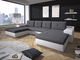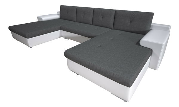 Moderná rohová sedačka v tvare U s dvojfarebnou kombináciou tkaniny a ekokože, v sivej a bielej farbe, je ideálna pre najnáročnejších zákazníkov. Štyri veľké vankúše zabezpečia pohodlné sedenie, zároveň široké opierky rúk môžu slúžiť aj ako odkladací priestor. Konštrukcia z masívneho dreva, drievotriesky, drevovláknitej dosky a preglejky, spolu s polyuretánovou penou a pružinami Faliste zaručia kvalitu a pohodlie. Sedačka sa dá rozložiť na lôžko na spanie a disponuje aj jedným úložným priestorom. Výška sedenia je 40 cm, hĺbka sedenia s vankúšmi 56 cm a bez vankúšov 80 cm. Sedačka má aj jednu opierku s výškou 54 cm, šírkou 30 cm a hĺbkou 79 cm. Nožičky sú chrómové. Tkanina Sawana je jemná s vysokou odolnosťou a zložená z 100% polyesteru. Ekokoža Mandarin MA je mäkká, flexibilná, farbostála a zložená z 100% polyuretánu. Sedačka sa dodáva v 3 balíkoch.
