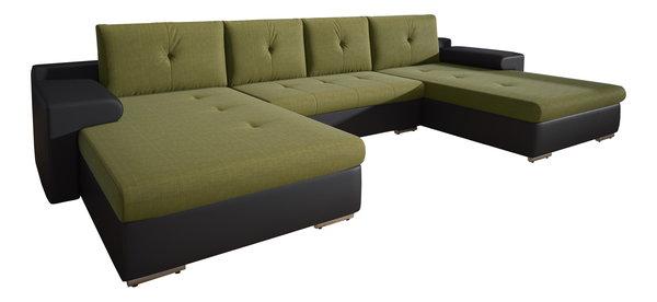 Rohová sedačka U Marlon (zelená + čierna) (L) v tvare U je moderná sedacia súprava, ktorá splní požiadavky aj tých najnáročnejších zákazníkov. Tento kúsok určite upúta vašu pozornosť vďaka svojej dvojfarebnej kombinácii tkaniny a ekokože. Sedačka má štyri veľké vankúše pre pohodlné sedenie a široké opierky rúk, ktoré môžu poslúžiť aj ako odkladací priestor. Konštrukcia stojí na nízkych kovových nožičkách a disponuje jedným úložným priestorom. Mohutná rohová sedacia súprava je vyrobená z masívneho dreva, drevenej dosky a preglejky. Výplň sedačky tvorí polyuretánová pena a pružiny Faliste. Sedačka je tiež rozkladacia, takže môže slúžiť aj ako lôžko na spanie. Plocha spania je 300 x 120 cm a výška sedenia je 40 cm. Celkové rozmery sú 78 cm výška, 181 cm hĺbka a 130 cm šírka medzi otomanmi. Sedačka obsahuje 4 vankúše a je potiahnutá tkaninou Sawana a ekokožou Mandarin MA, ktoré sú odolné voči oderu a zároveň veľmi príjemné na dotyk. Balenie obsahuje 3 balíky s celkovou hmotnosťou 158 kg.