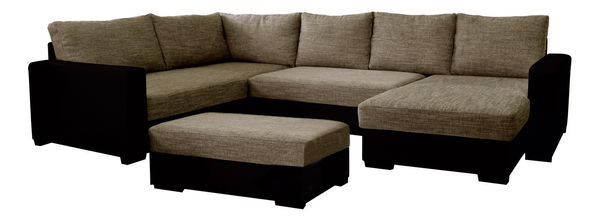 Moderná rohová sedačka do tvaru písmena U, sa dokonale hodí do obývacej izby s nadčasovým nábytkom. Je celočalúnená dvomi materiálmi: koženkou a šenilom. Je nerozkladacia, no spací priestor vznikne prisunutím taburetky. Svetlohnedá sedacia časť je doplnená o hnedú a čierne plastové nožičky. Šírka operadla (bočnice) je 17,5 cm.